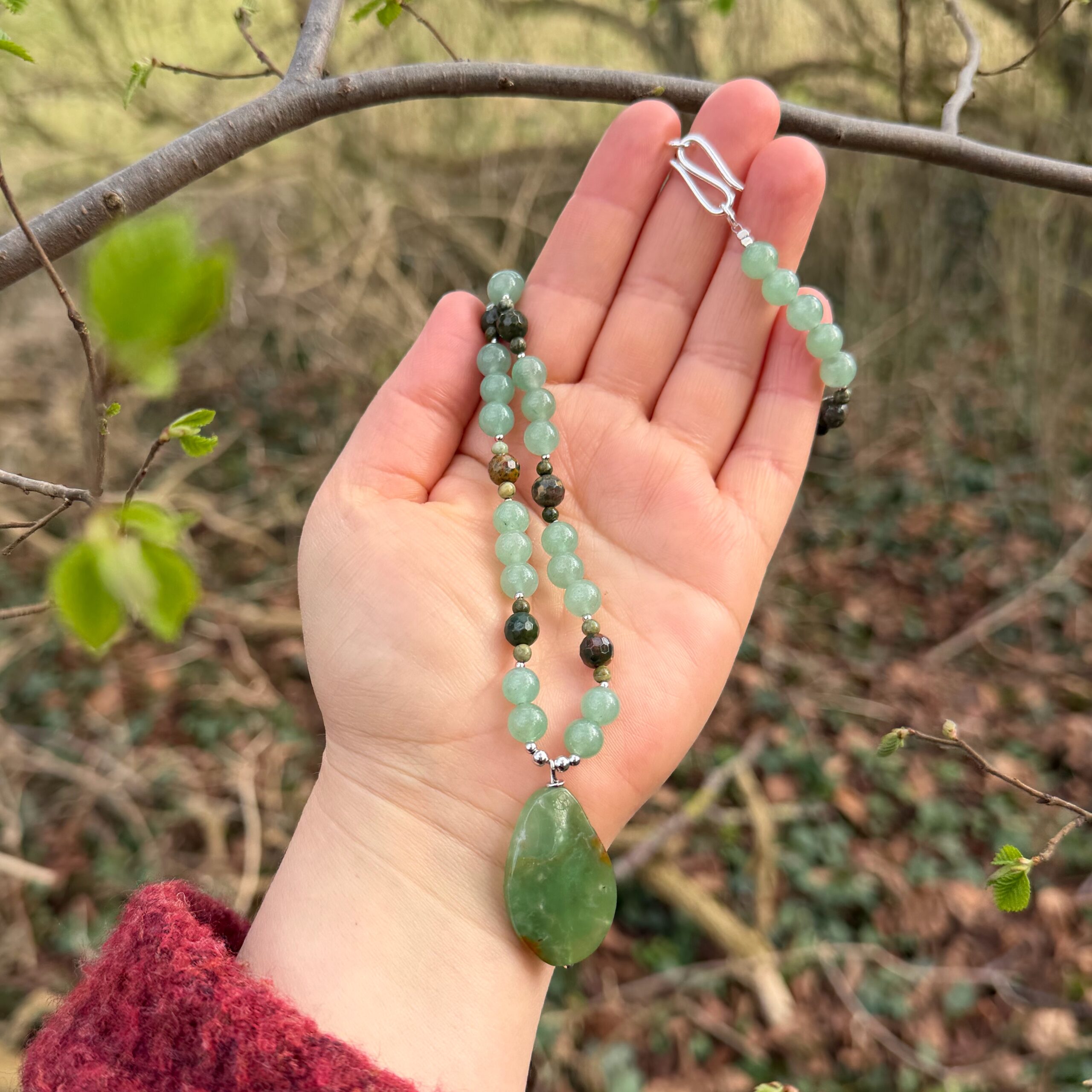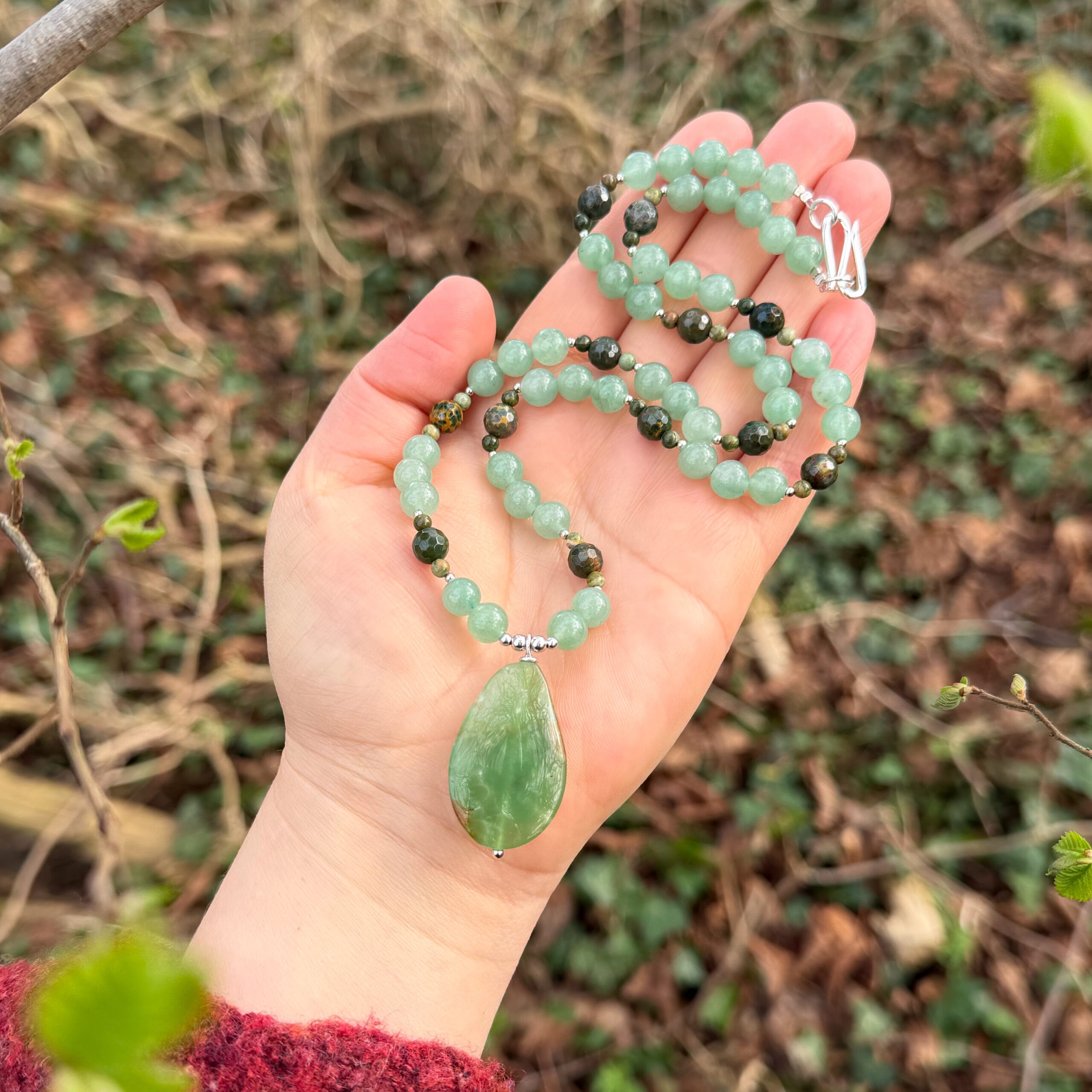 Diese besondere Kette aus Aventurin, Heliotrop und einem kraftvollen Chrysopras-Mittelstein verbindet dich tief mit der Energie des Herzens und der lebendigen Kraft der Natur.