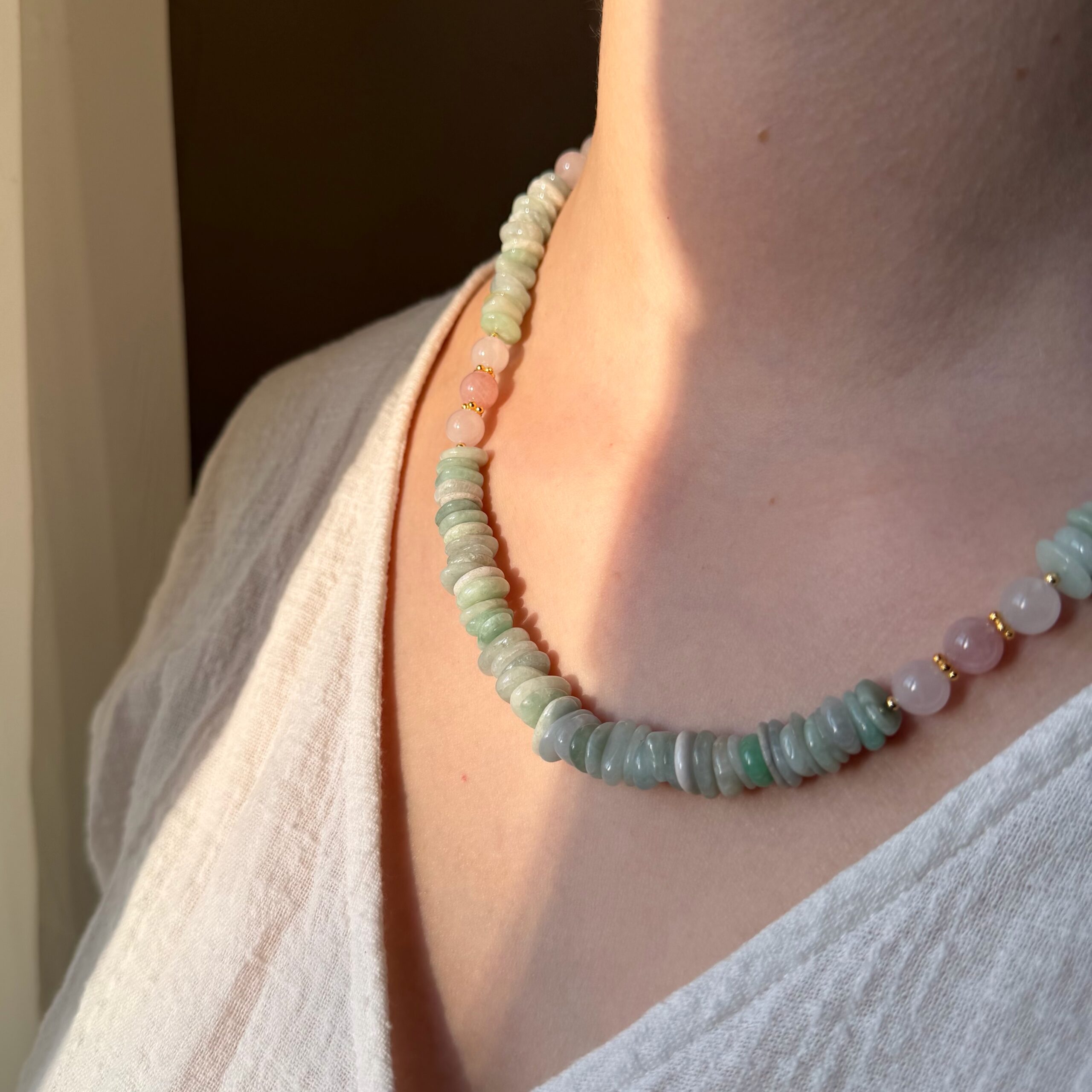 Diese handgefertigte Statement-Kette aus Jadeit und Rosenquarz verbindet ruhige Harmonie mit sanfter Herzenergie.
