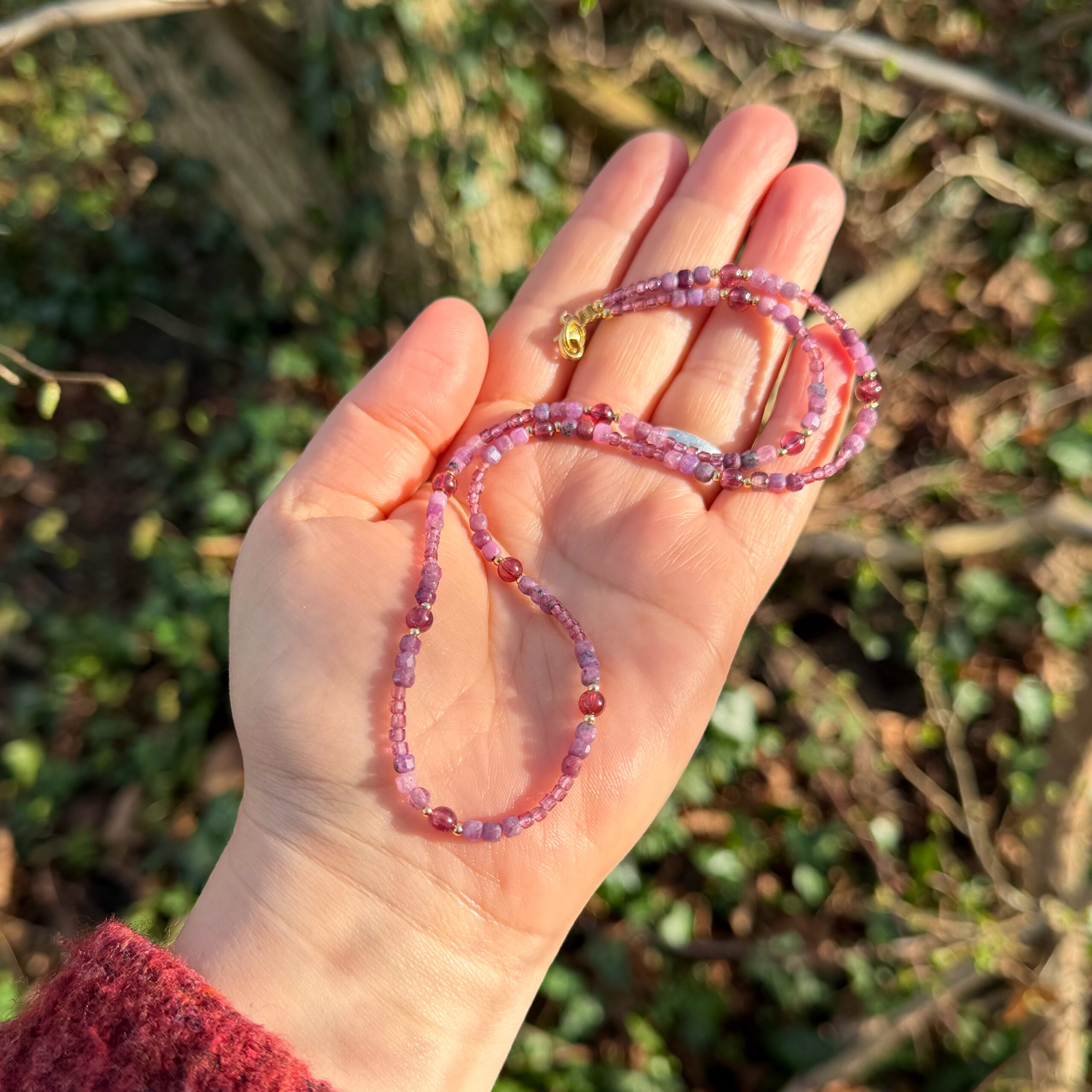 Diese feine Kette aus Rubin und Granat trägt eine kraftvolle, lebendige Herz- und Erdenergie.