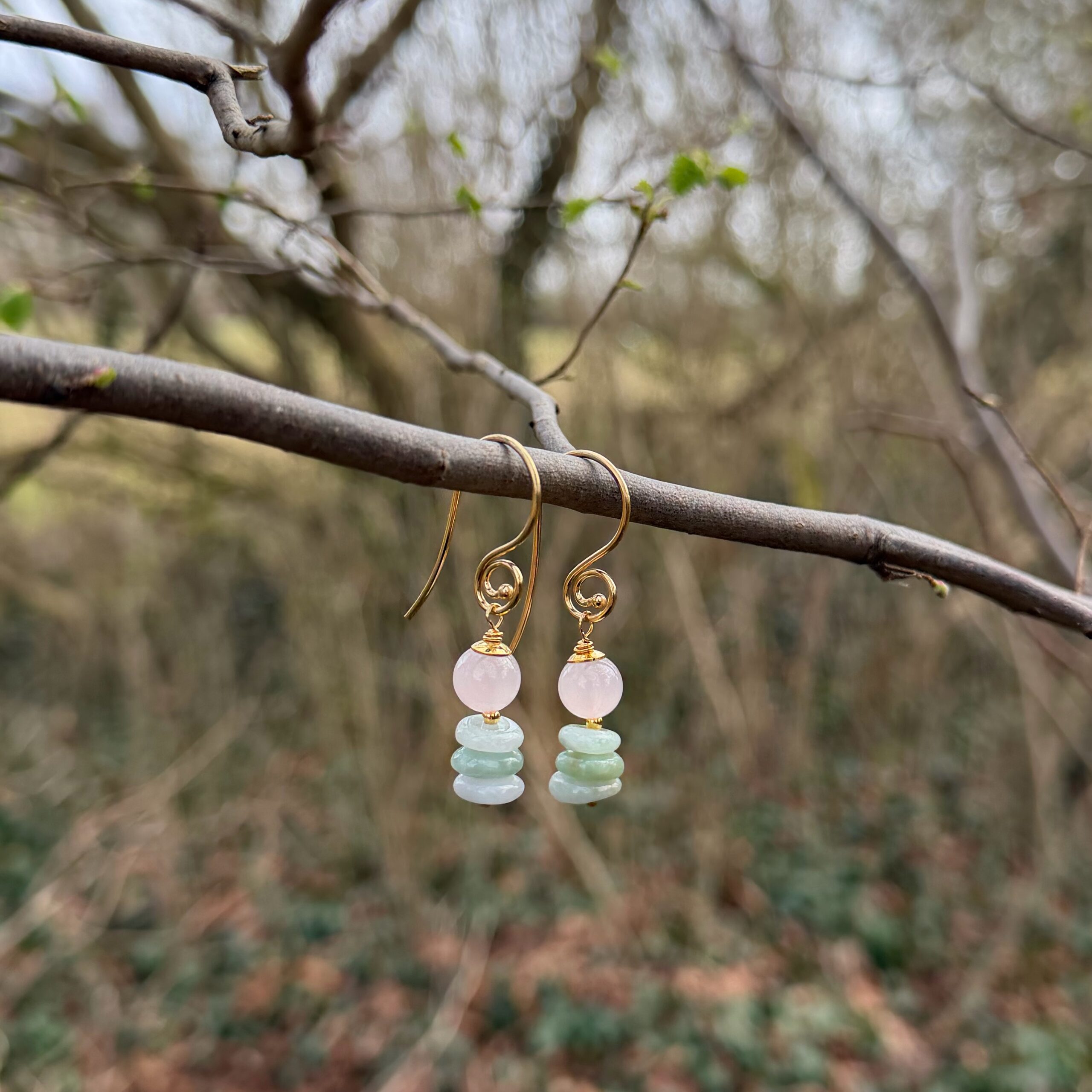 Diese feinen Ohrhänger aus Jadeit und Rosenquarz vereinen sanfte Herzenergie mit harmonisierender Lebensfreude.