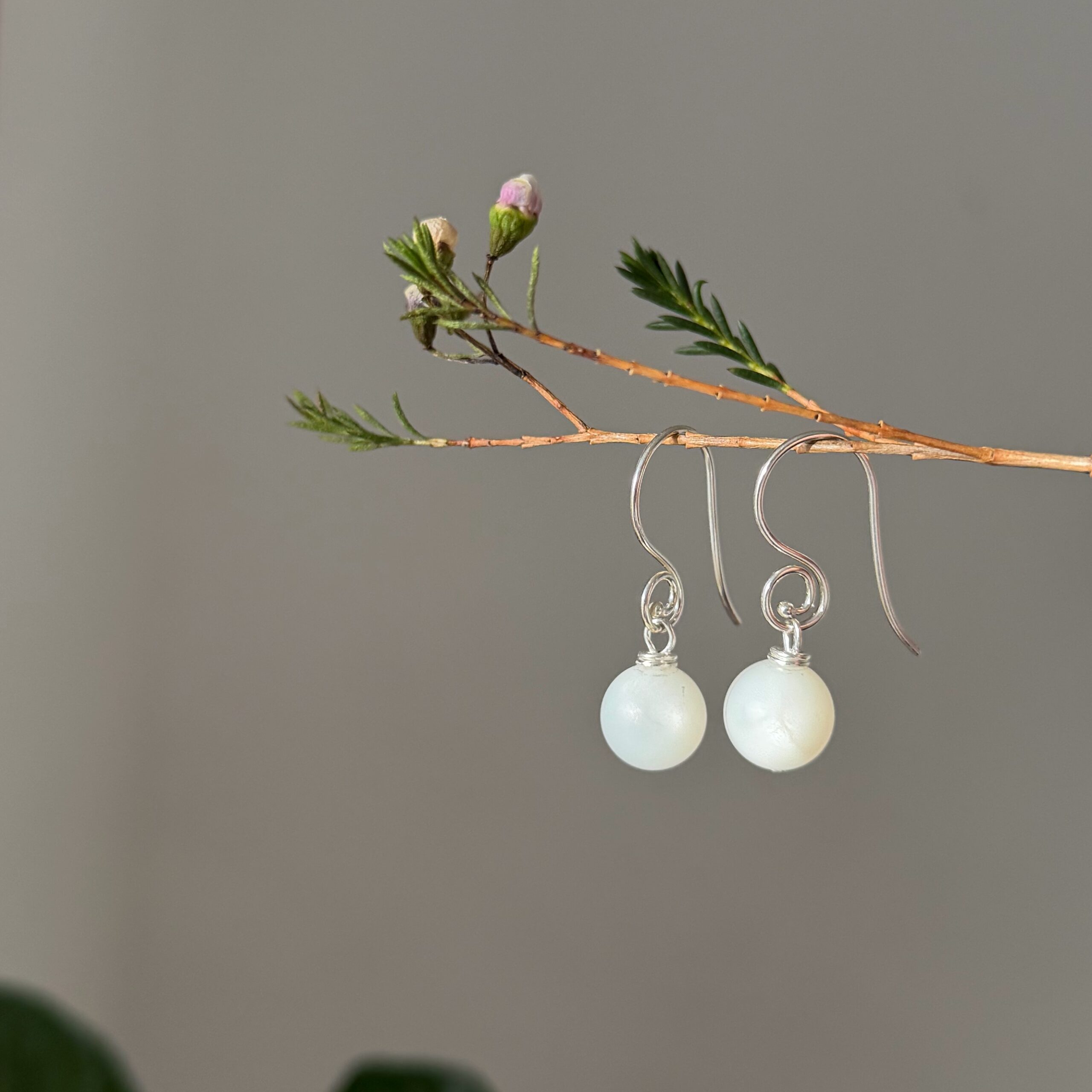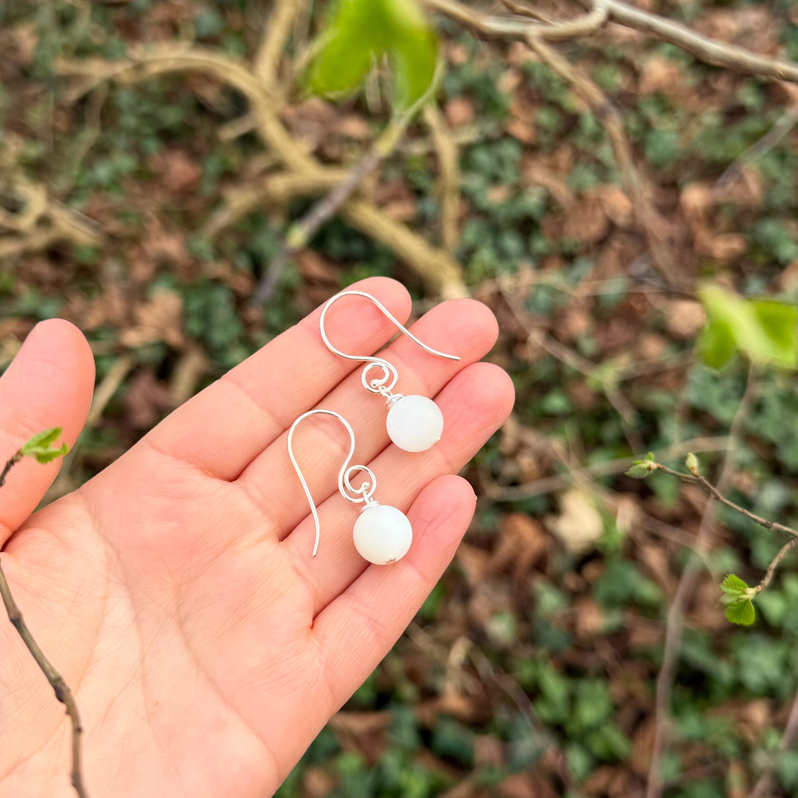 Diese schlichten Ohrhänger aus mattem Mondstein tragen eine besonders ruhige, intuitive Mondenergie.