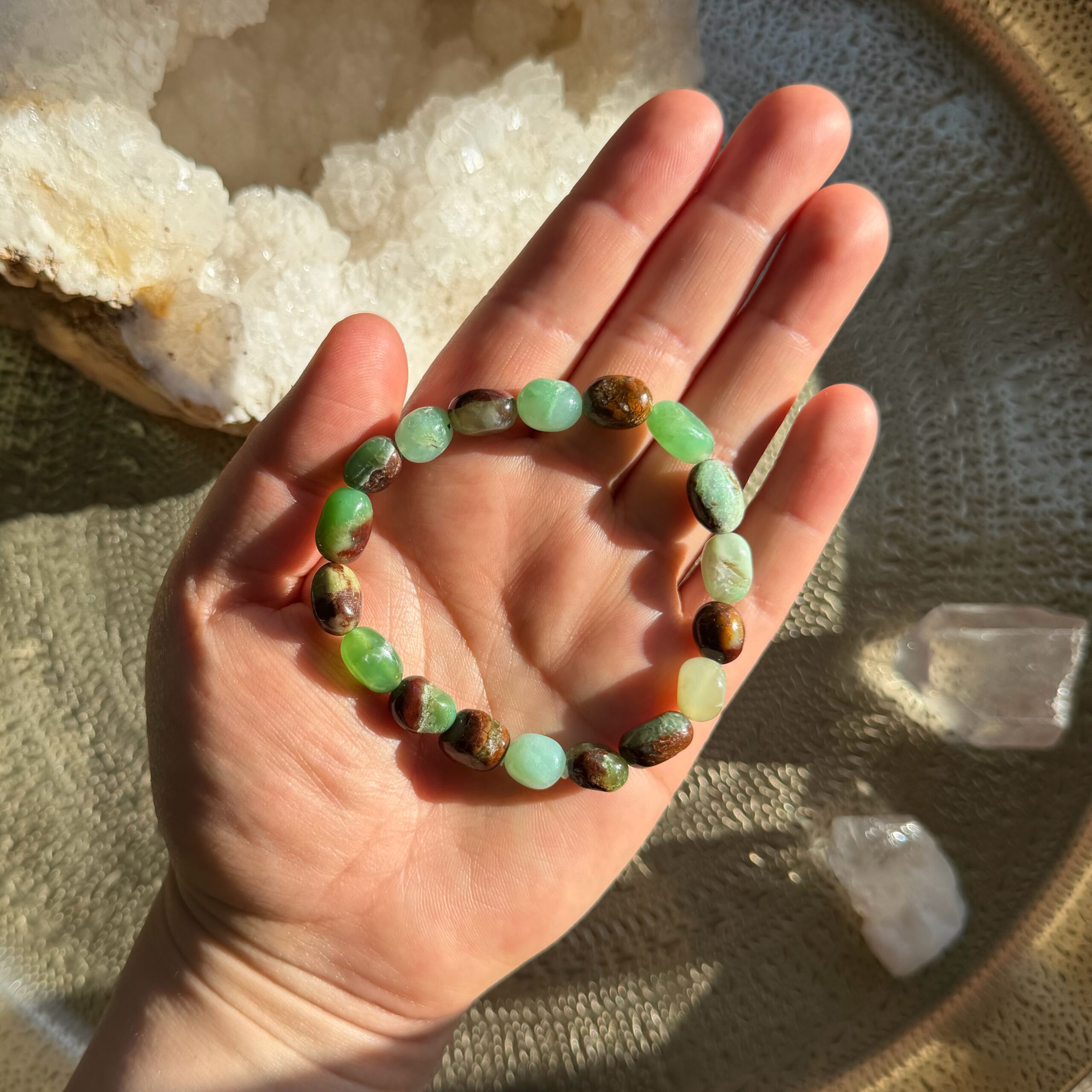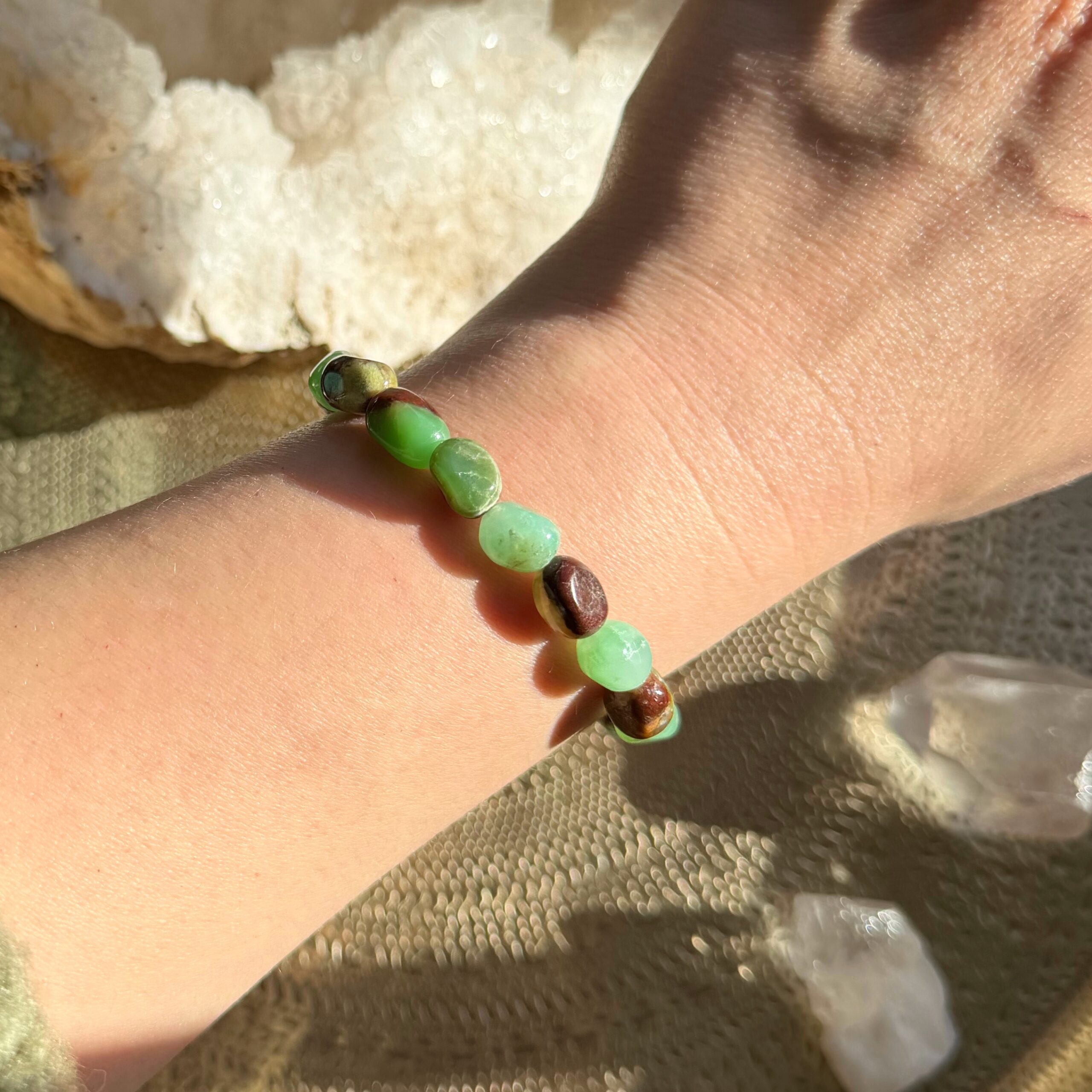 Dieses Chrysopras-Armband trägt eine frische, lebendige Herzenergie in sich. Die sanften bis kräftigen Grüntöne sind beinahe wie ein tiefer Atemzug in der Natur und wirken klärend, öffnend und zugleich stärkend.
