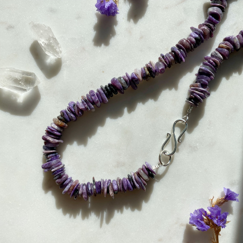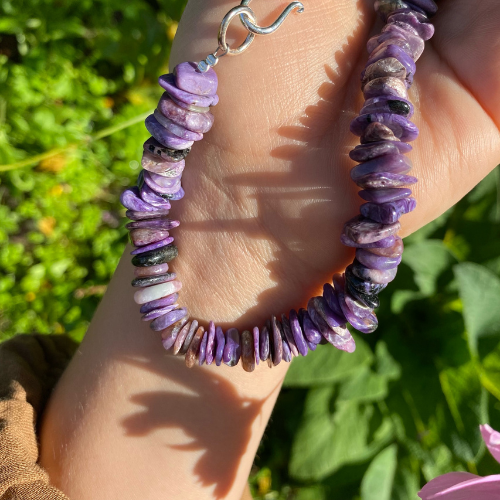 Handgefertigte Kette mit leuchtenden, großen Charoit Splitterperlen in Topqualität und einem edlen Schmuckverschluss. Charoit ist ein besonders seltenes Mineral, welches weltweit nur an einem einzigen Ort vorkommt und zwar in Sibirien. Seine spezielle violette Farbe, zusammen mit dem silbrig ‚durchwirbelten‘ Muster machen ihn absolut einzigartig und unverwechselbar. Charoit ist ein kraftvoller Edelsteinbegleiter in Zeiten der Transformation und des Wandels.