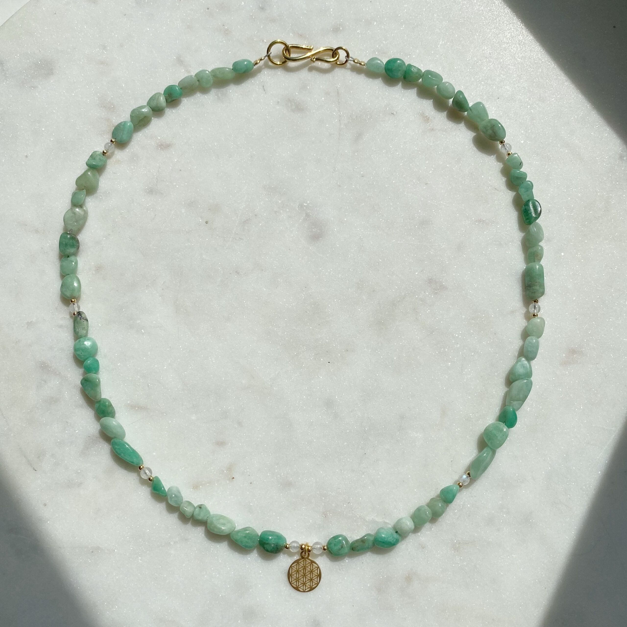 Die GRÜNE GÖTTIN vereint die kraftvolle Energie von Smaragd, den sanften Schimmer des Regenbogenmondsteins und das heilige Symbol der Blume des Lebens zu einem harmonischen Schmuckstück voller Tiefe und Ausstrahlung. Der Smaragd steht für Wachstum, Lebenskraft & Erneuerung und verbindet dich mit der Schönheit und Fülle der Natur. Der Regenbogenmondstein schenkt intuitive Klarheit, innere Balance und einen Hauch von Magie. Die Blume des Lebens in zartem Gold symbolisiert die Harmonie der Schöpfung und den unendlichen Kreislauf des Lebens. Dieses Schmuckstück ist deine Erinnerung an deine Verbundenheit mit der Erde und dein göttliches Strahlen!