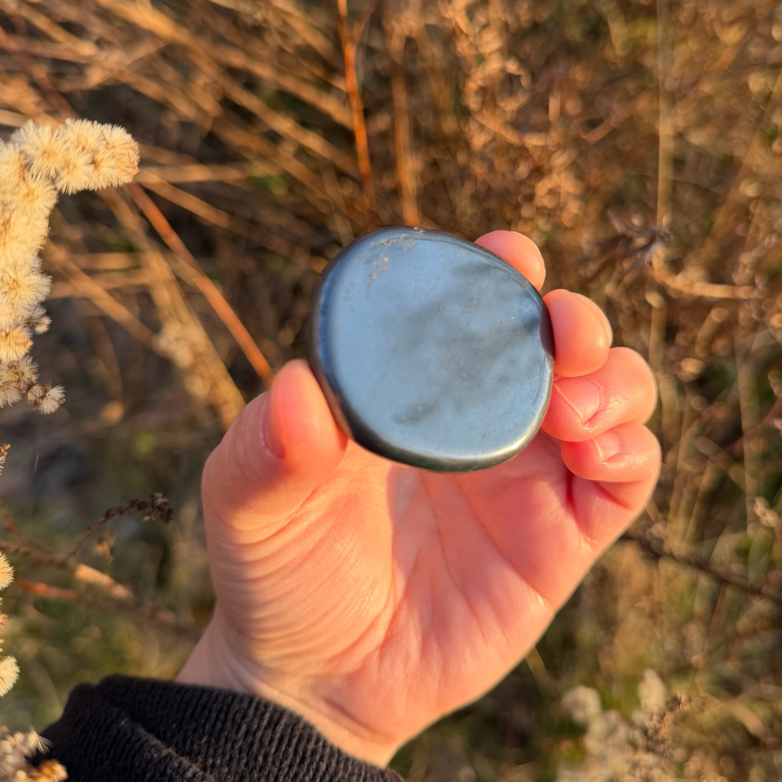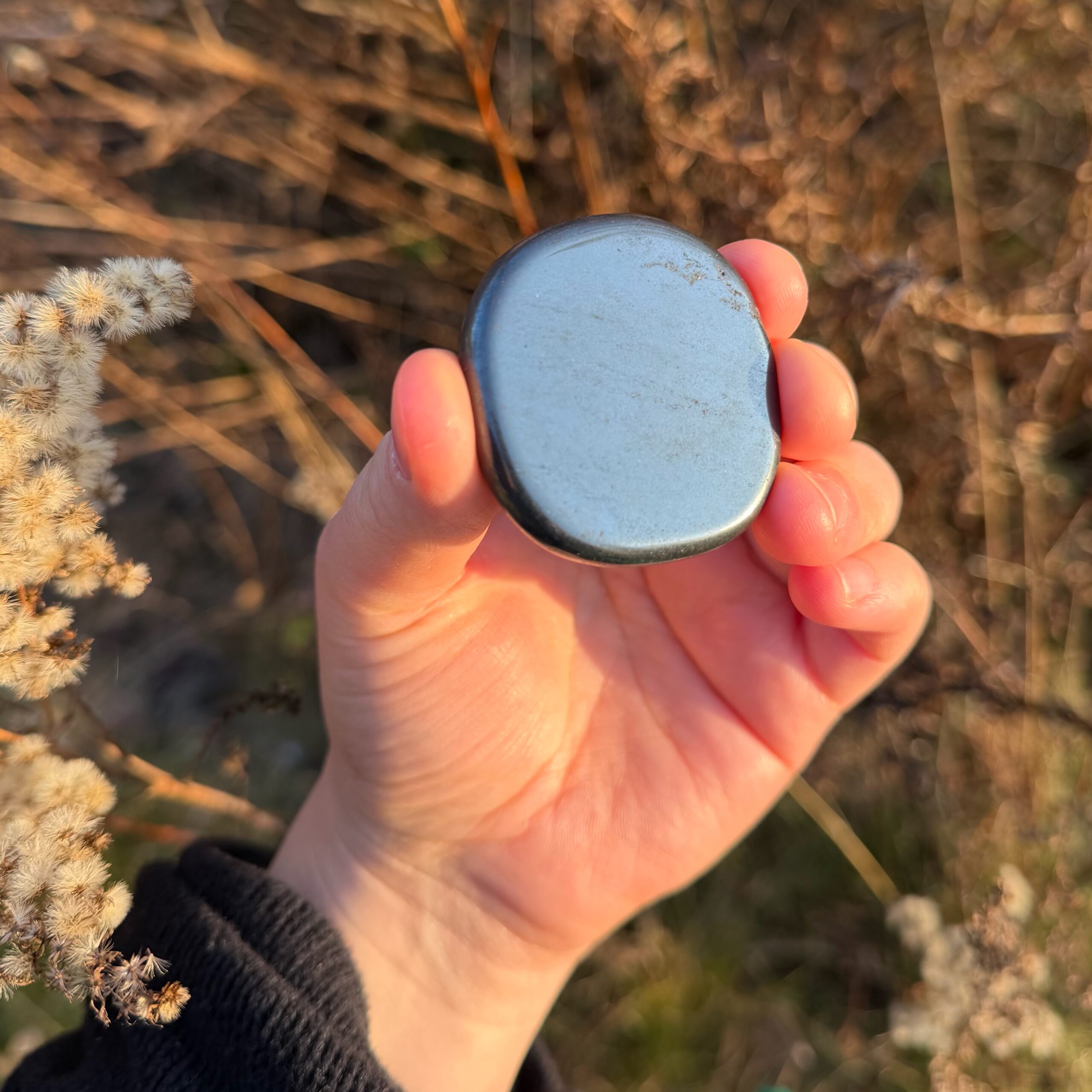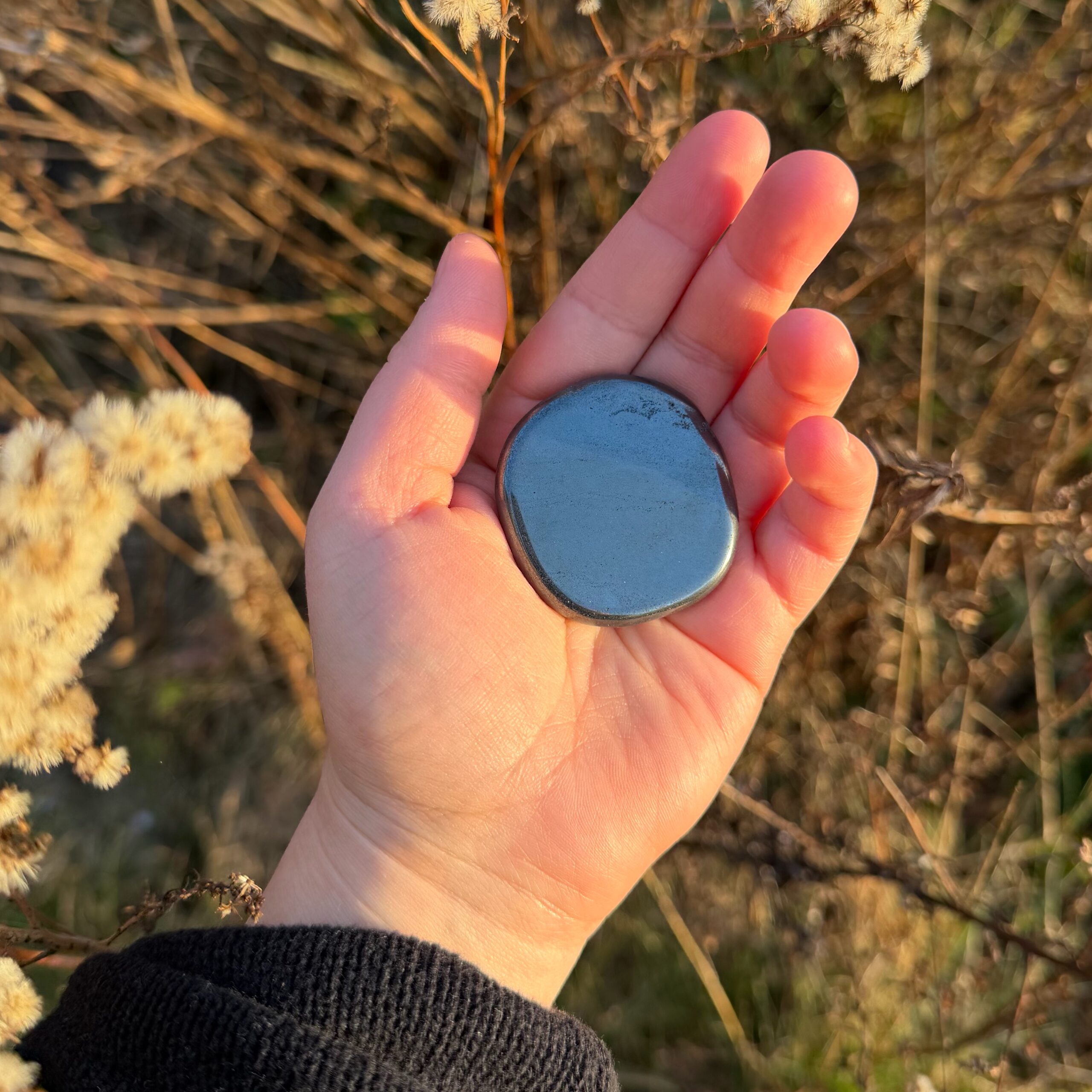 Dieser glatt geschliffene Hämatit liegt spürbar schwer in der Hand und vermittelt sofort Erdung und Stabilität. Seine dichte, kraftvolle Energie unterstützt dabei, im Hier und Jetzt anzukommen, innere Stärke zu sammeln und einen klaren Stand einzunehmen. Jeder Stein wird von mir achtsam energetisch aufgeladen und ist ein verlässlicher Begleiter für Fokus, Schutz und Zentrierung im Alltag.