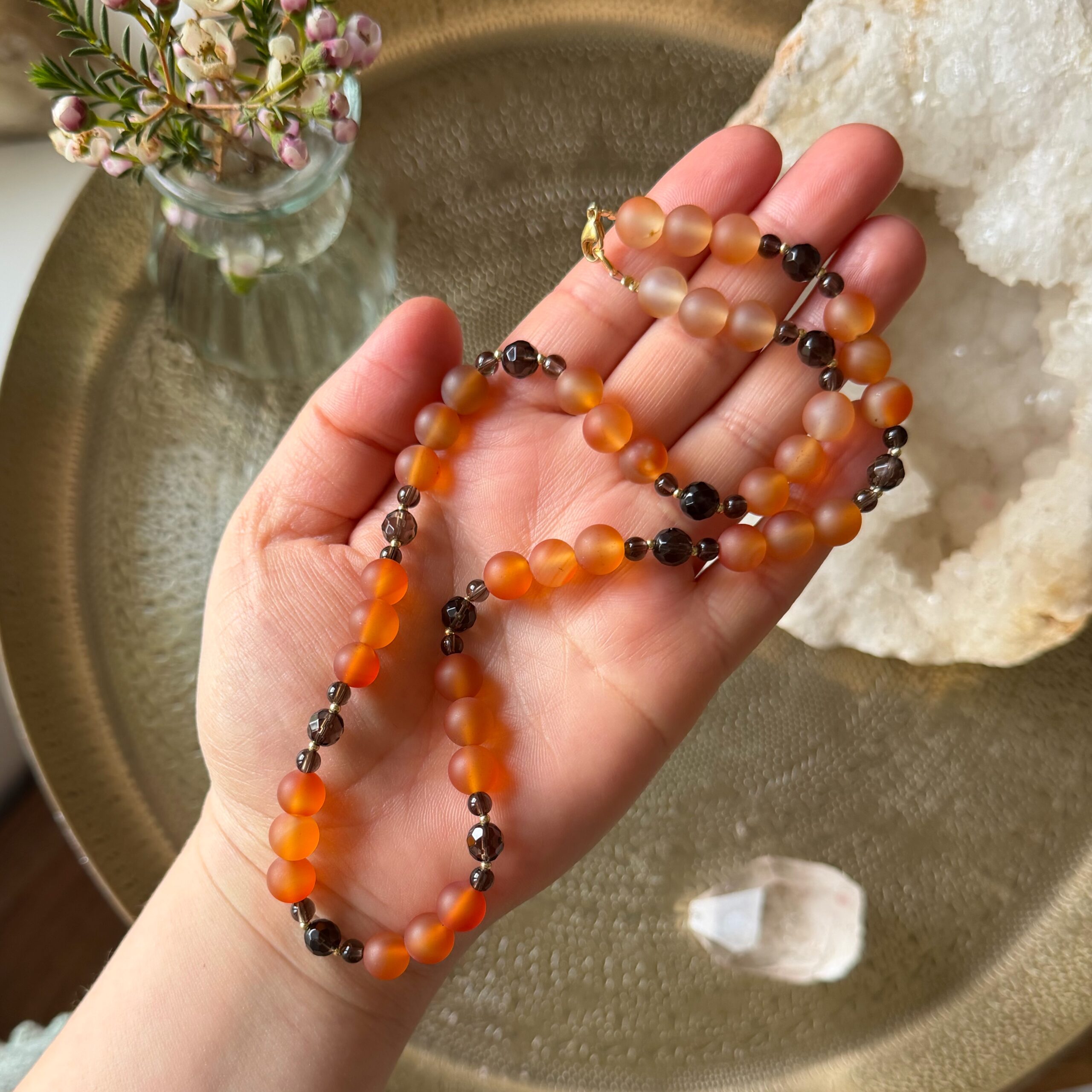 Eine harmonische Begleiterin aus mattem Karneol in warmen Orange- und Apricottönen, kombiniert mit facettierten Rauchquarz-Elementen.