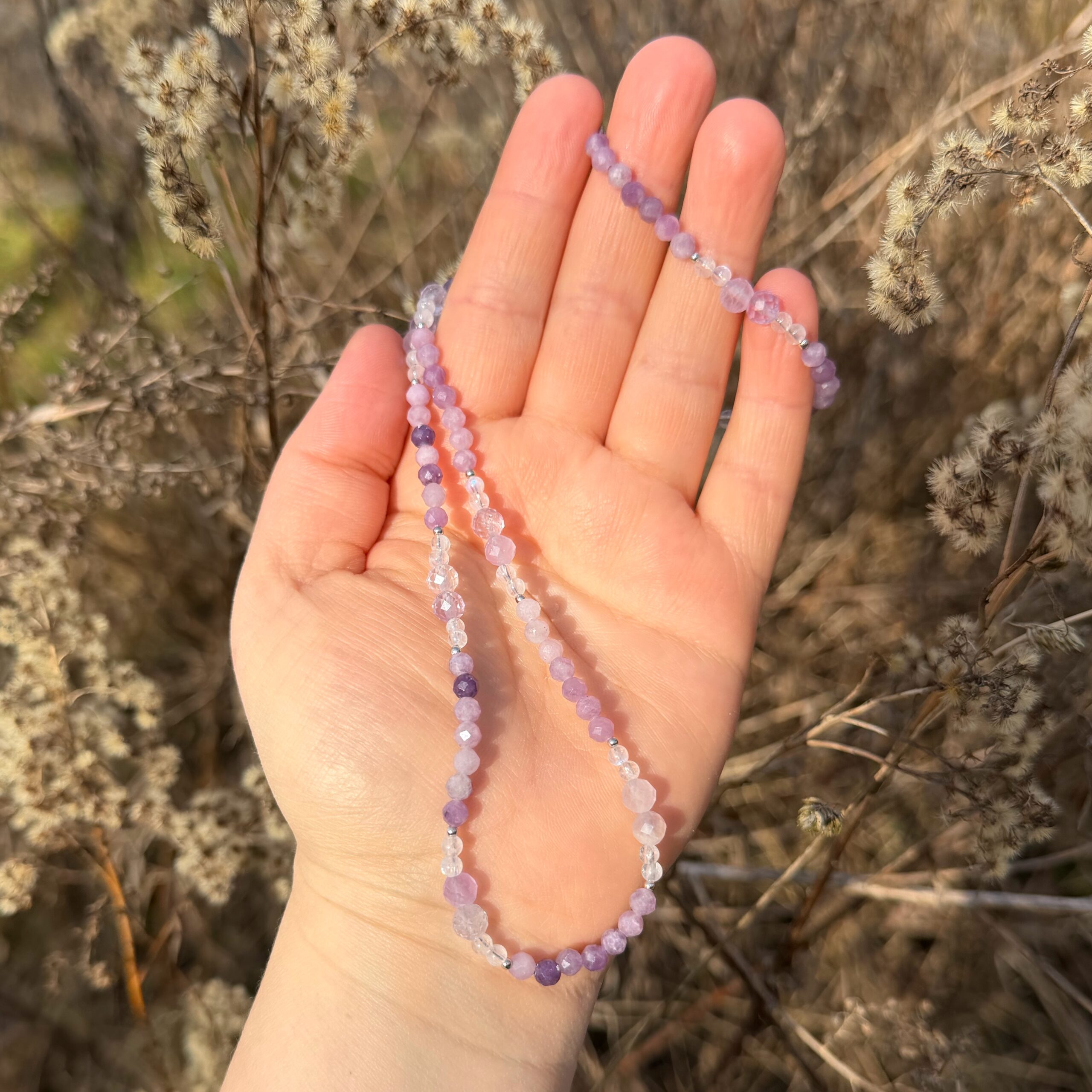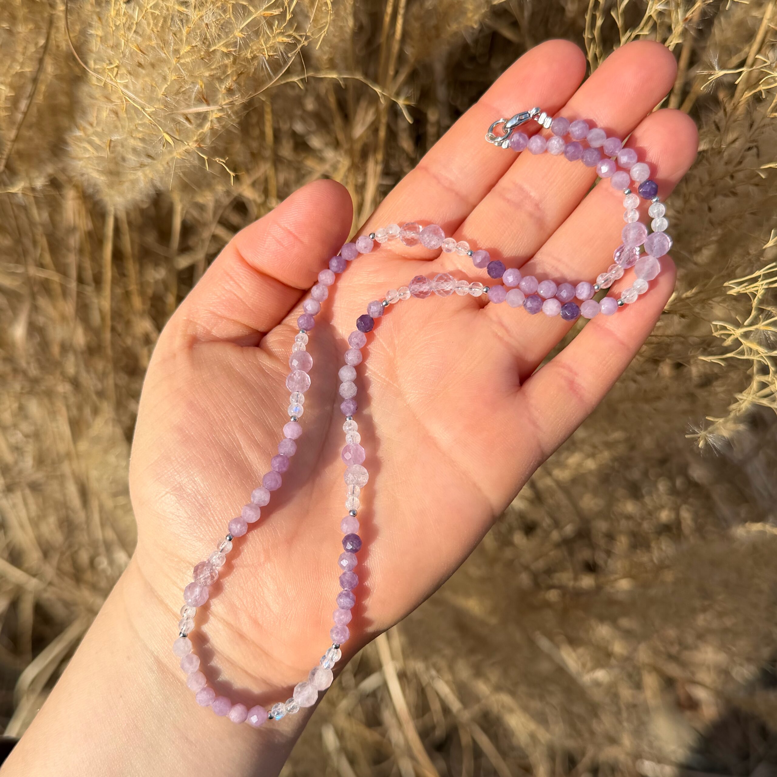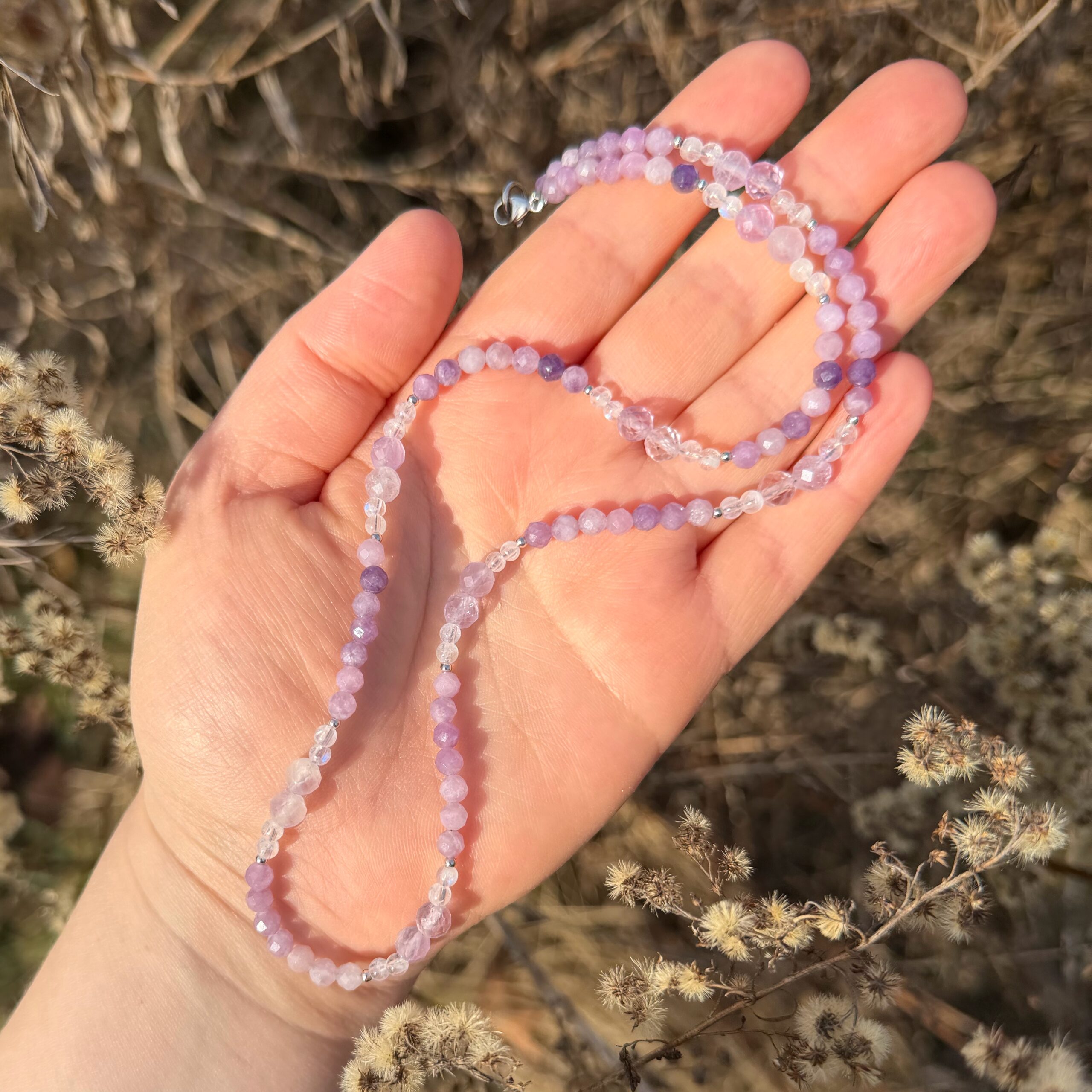 Zarte Kette mit Lepidolith · Amethyst · Regenbogenmondstein
