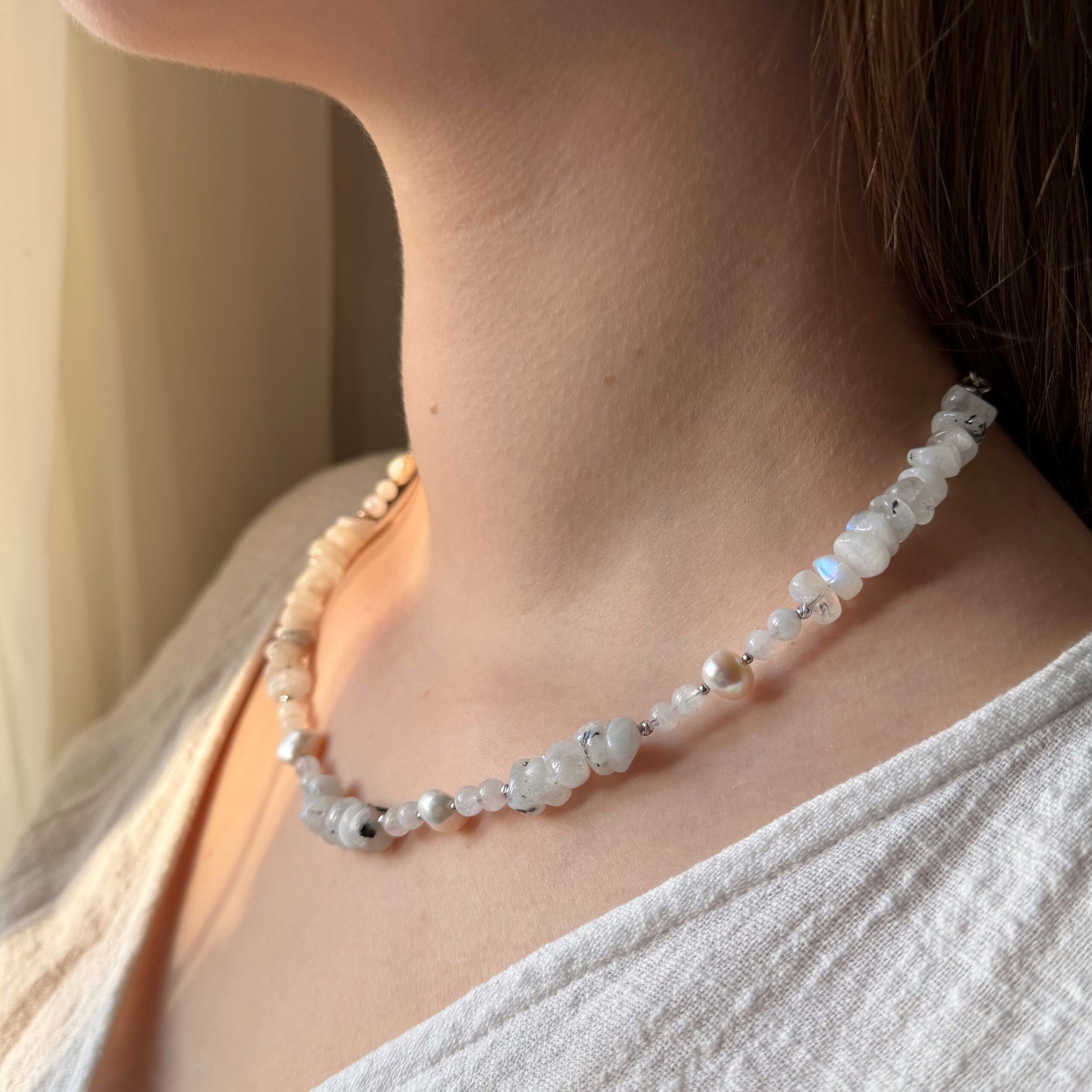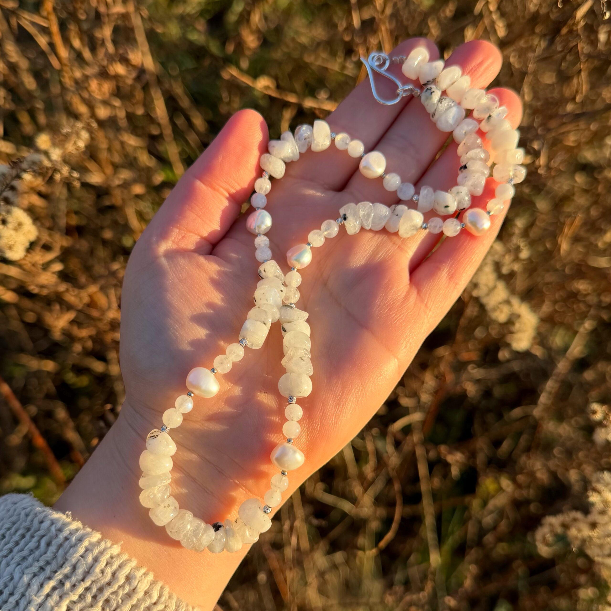 Diese Kette vereint die intuitive, lichtvolle Energie des Regenbogenmondsteins mit der sanften Weisheit der Süßwasserperlen. Sie unterstützt emotionale Balance, Vertrauen in die eigene Intuition und ein feines Gespür für innere Zyklen. Eine zarte, zugleich kraftvolle Begleiterin für Herz, Seele und kraftvollen Neubeginn.