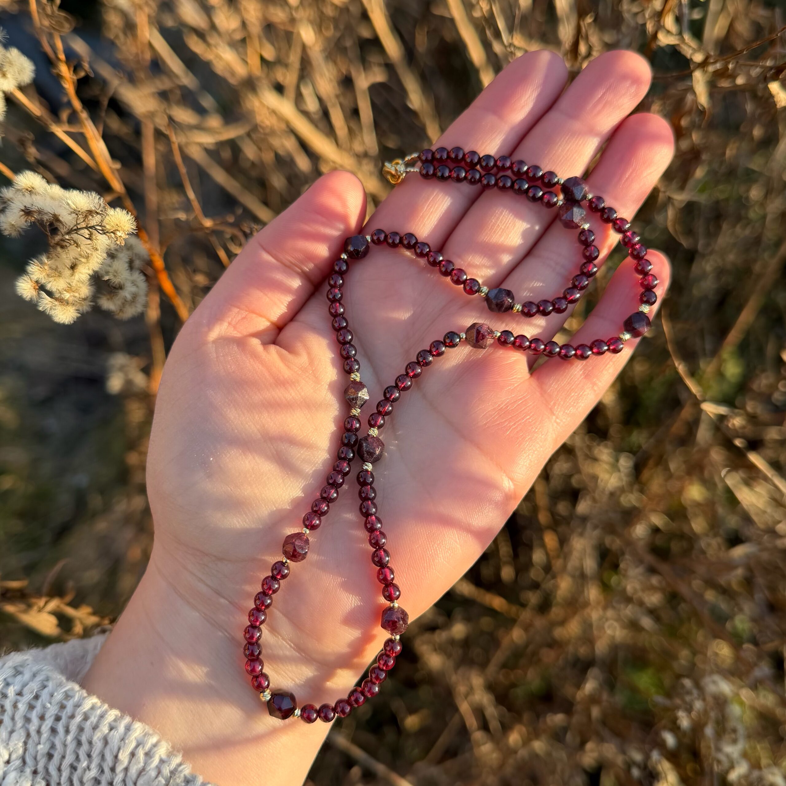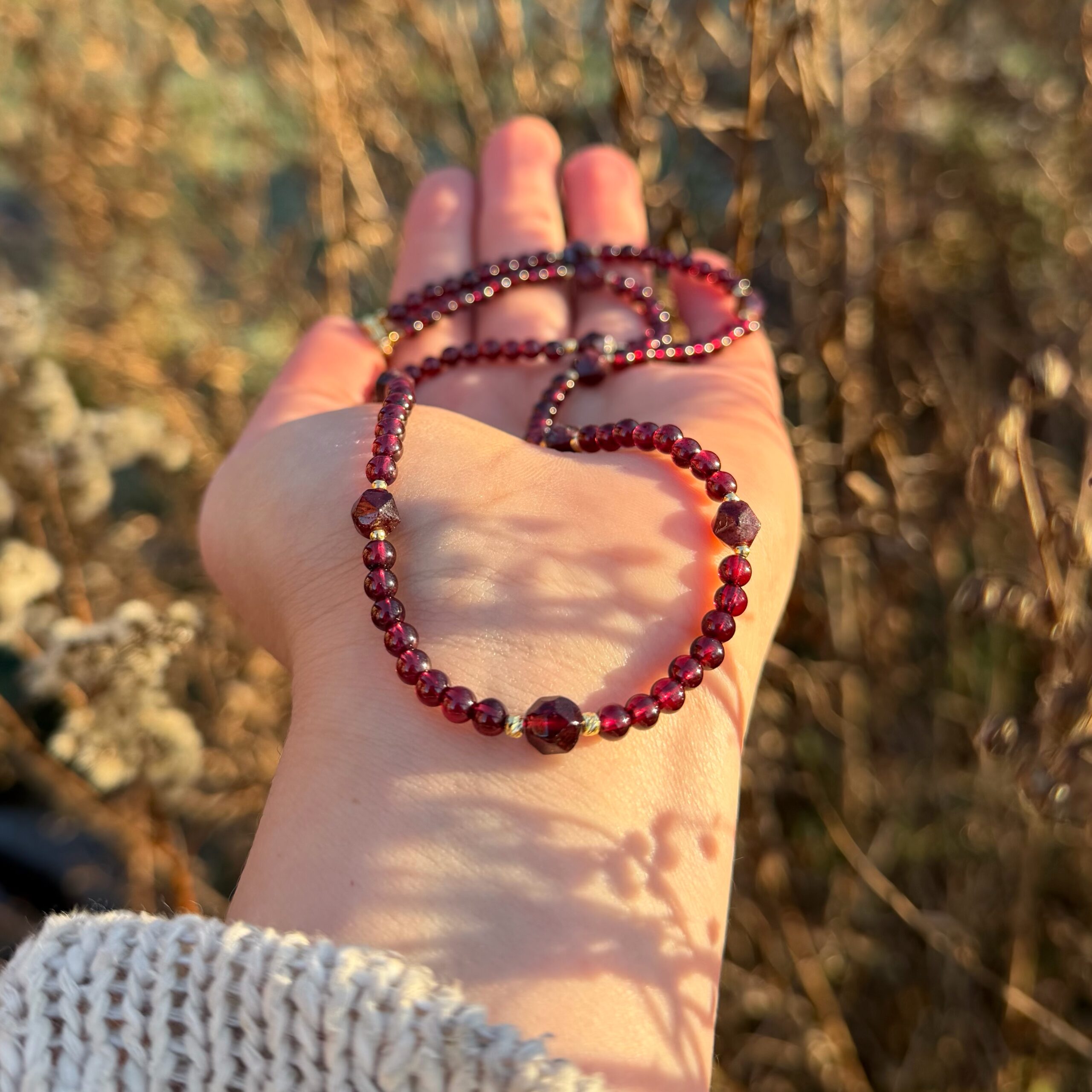 Diese handgefertigte Granat Kette trägt die Energie von innerer Stärke, Herzenskraft und stiller Würde.