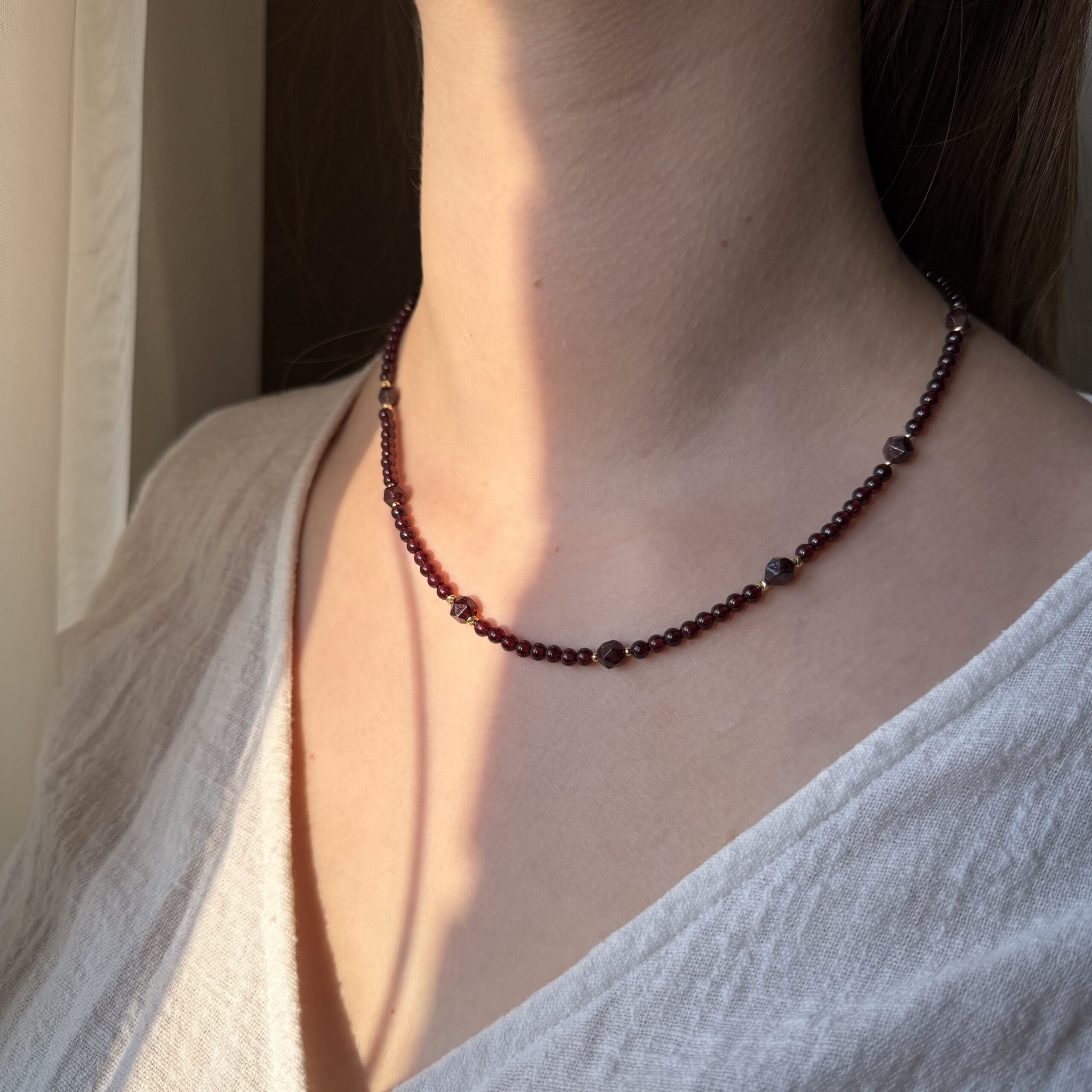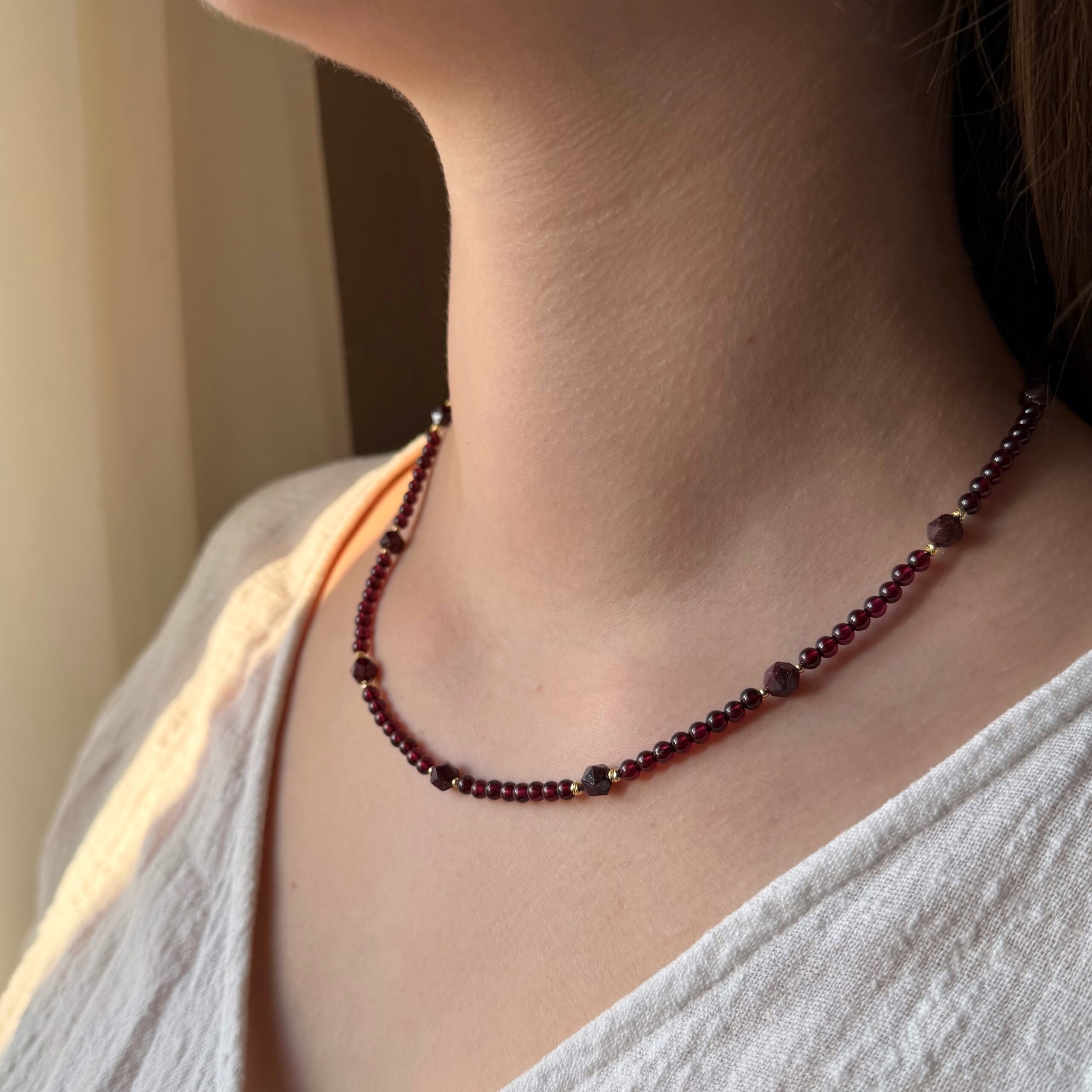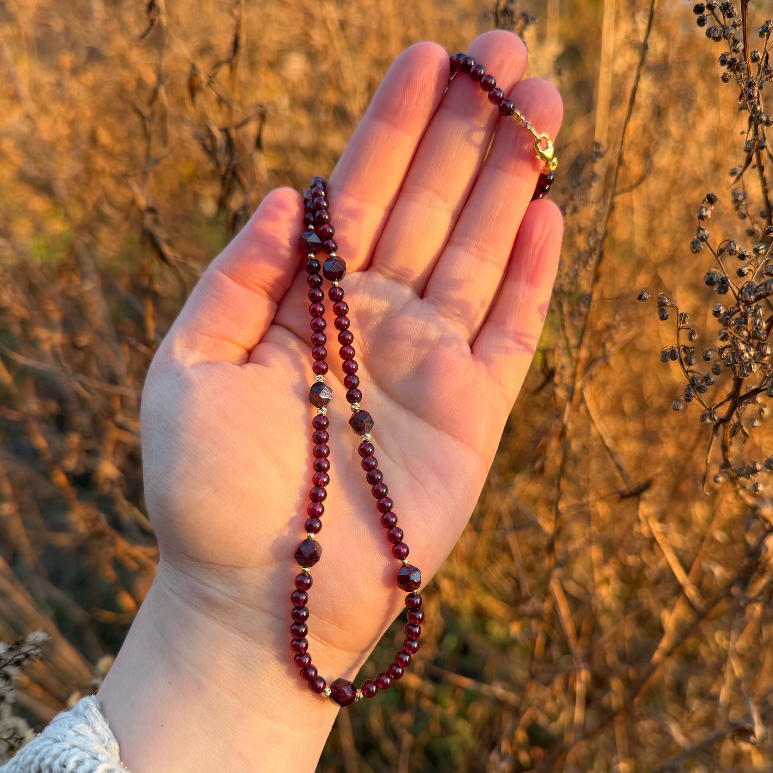 Der tiefrote Granat wirkt wie ein warmes Feuer im Inneren. Er schenkt Halt, Mut und Lebenskraft in Zeiten der Transformation und Weiterentwicklung. Granat wird energetisch mit dem Wurzel- und Herzraum verbunden: Er unterstützt dabei, dich im eigenen Körper zu verankern, deine eigene Wahrheit zu leben und dem Leben mit Vertrauen zu begegnen, auch in Zeiten des Wandels. Die facettierten Granate fangen das Licht dezent ein und verleihen der Kette eine edle, zeitlose Ausstrahlung.