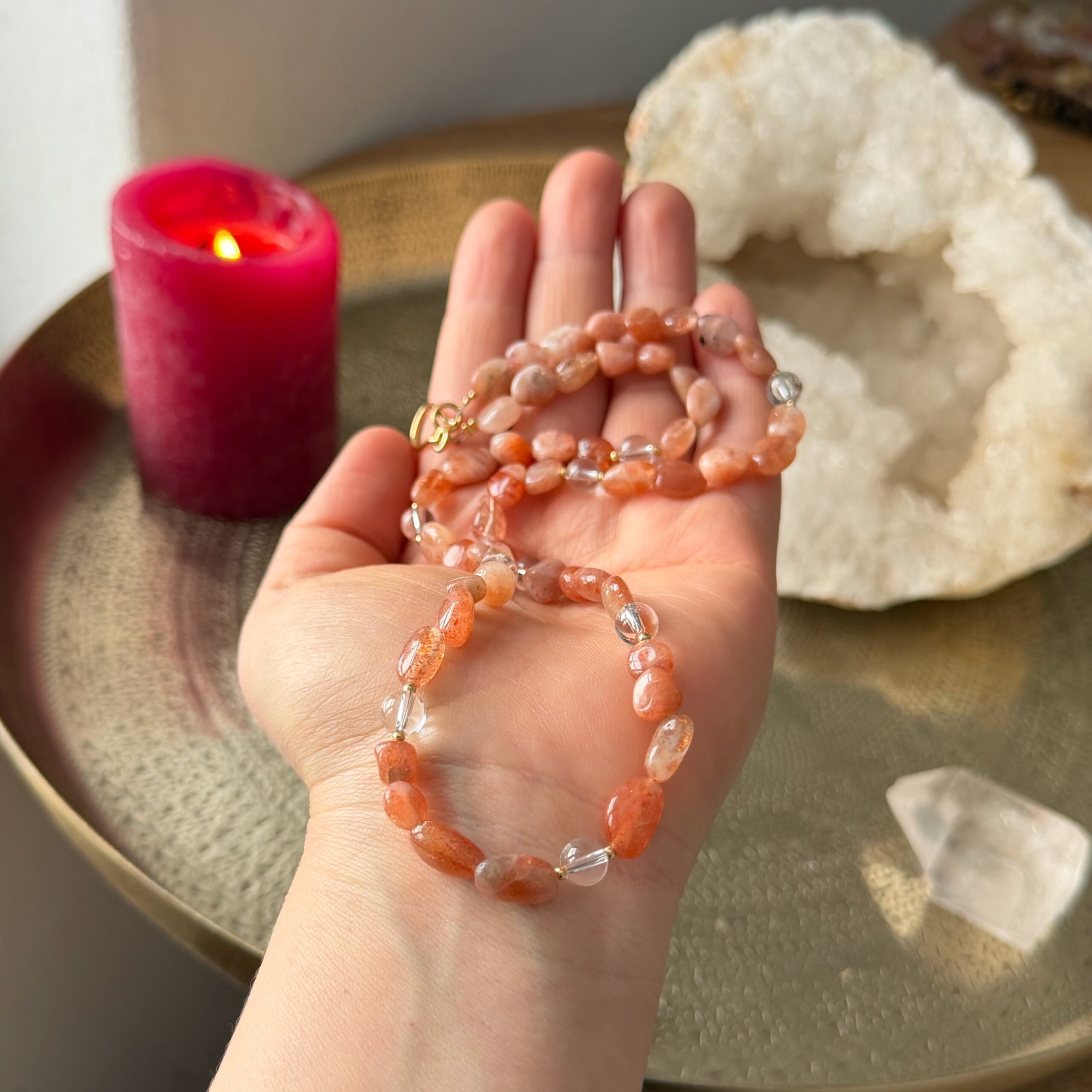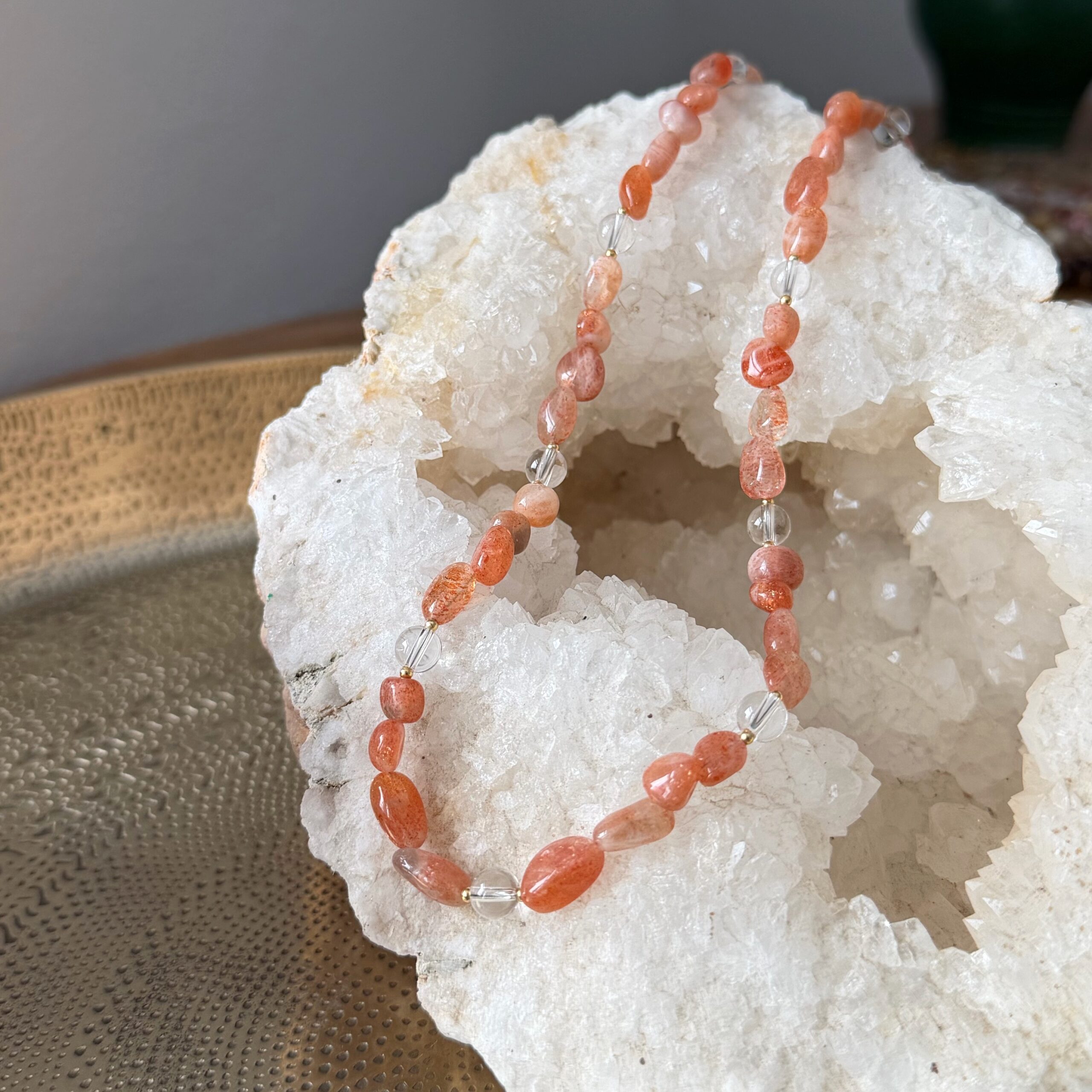 Diese handgefertigte Kette verbindet Sonnenstein mit klarem Bergkristall. Eine magische Kombination aus Lebensfreude und Klarheit.