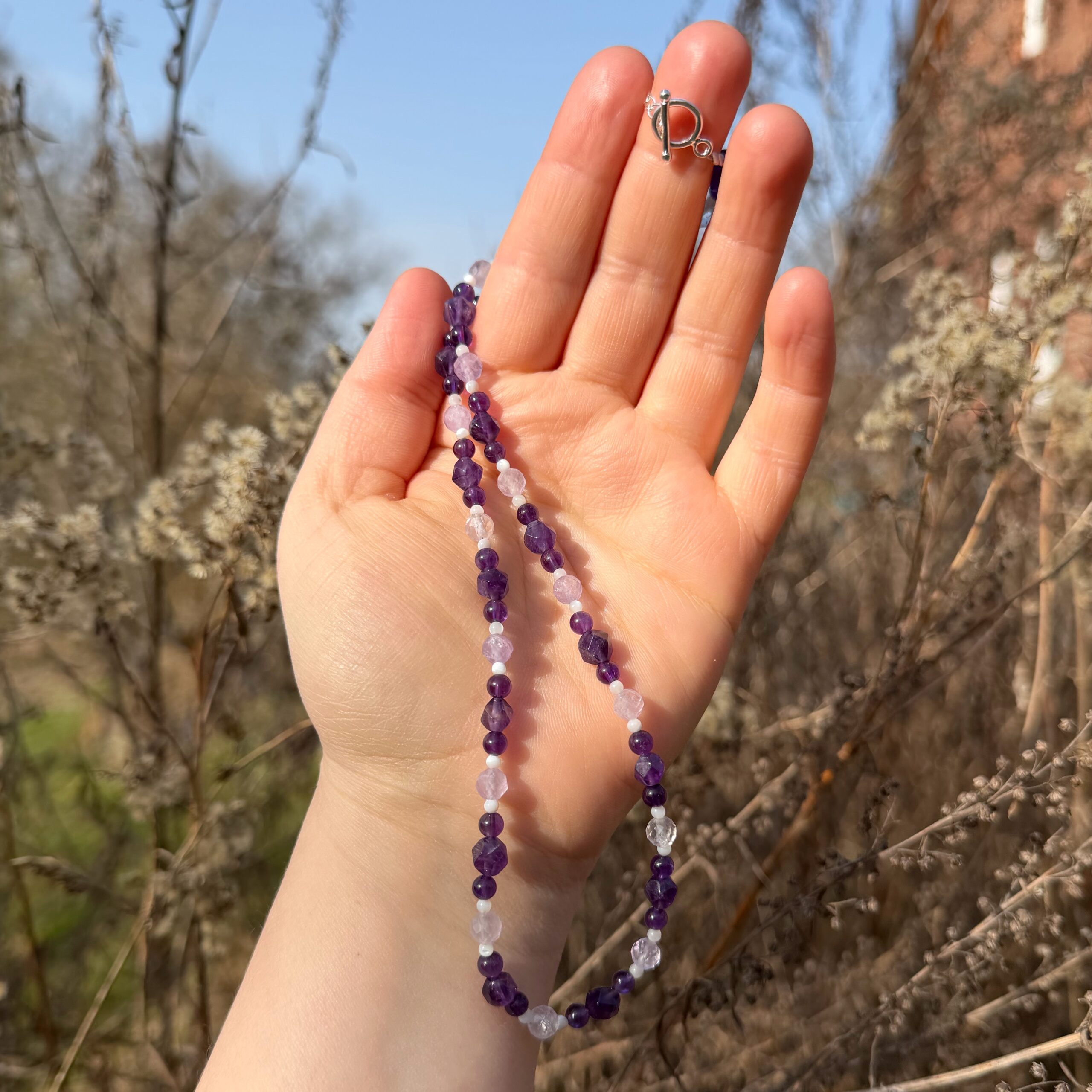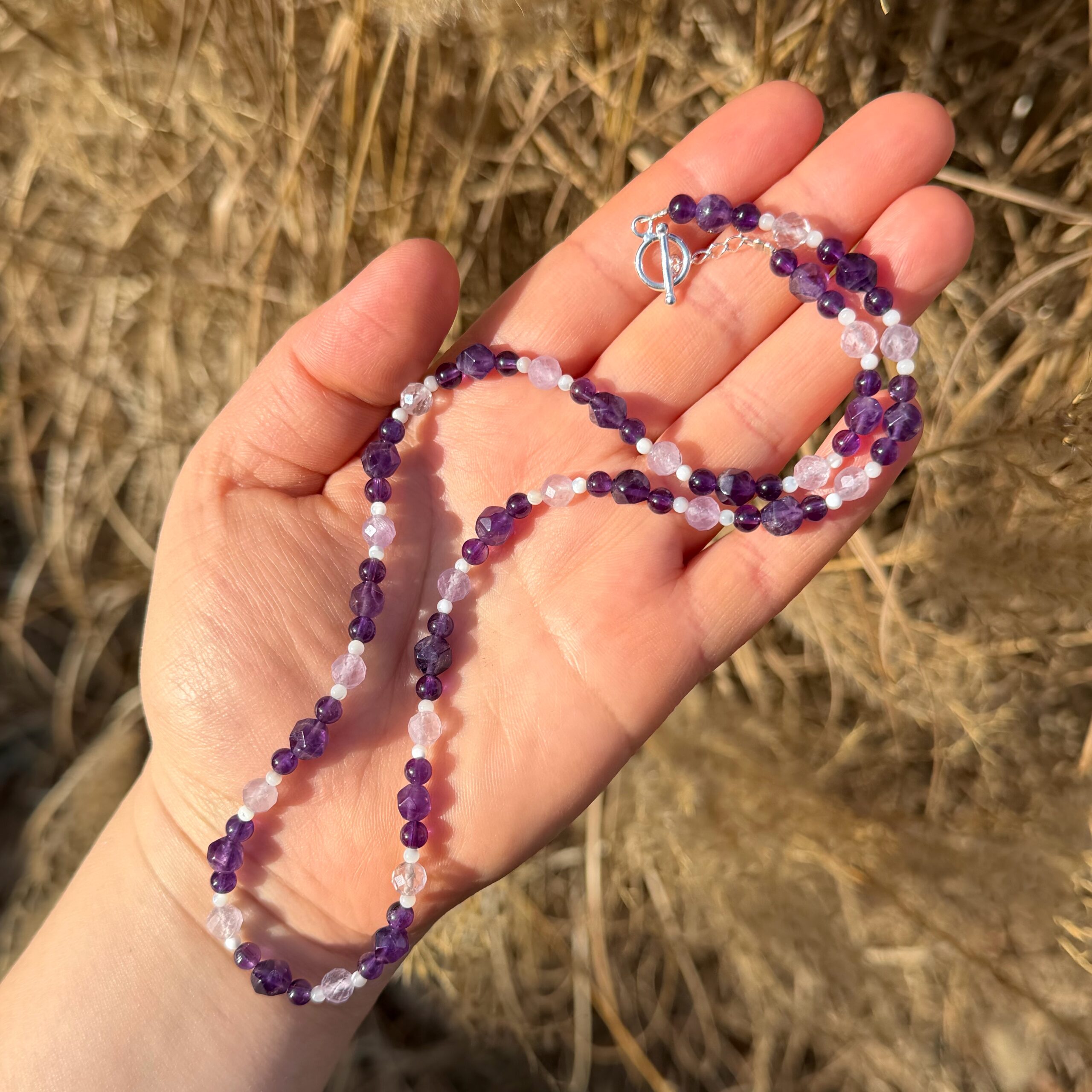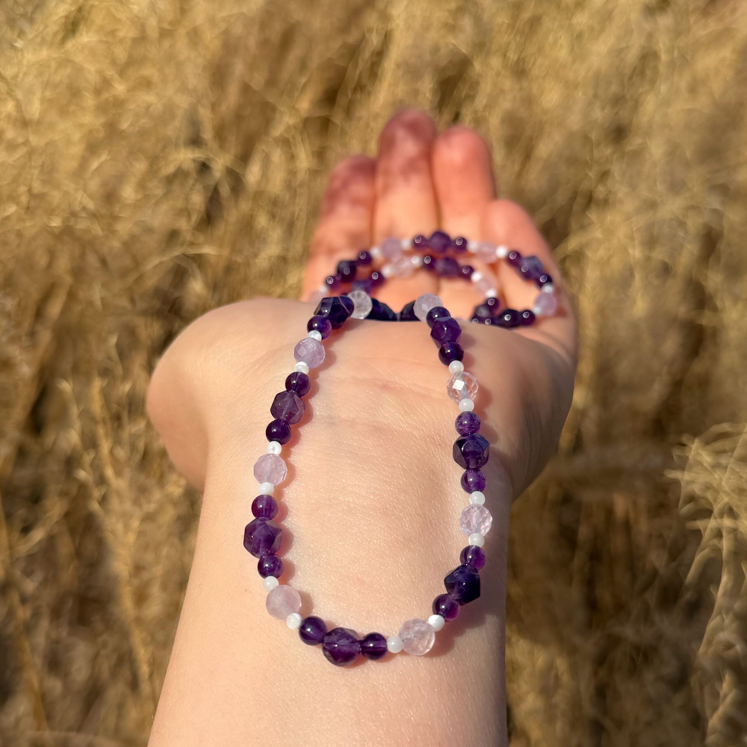 Diese zarte handgefertigte Kette vereint die tiefe, spirituelle Energie des Amethysts mit der sanften, lichtvollen Ausstrahlung von Perlmutt. Amethyst steht für Klarheit, eine starke Intuition und spirituelle Entwicklung. Seine Frequenz legt sich wie ein sanfter Schutzmantel um deine Aura und erinnert dich stets daran, deiner eigenen Intuition und inneren Weisheit zu vertrauen.