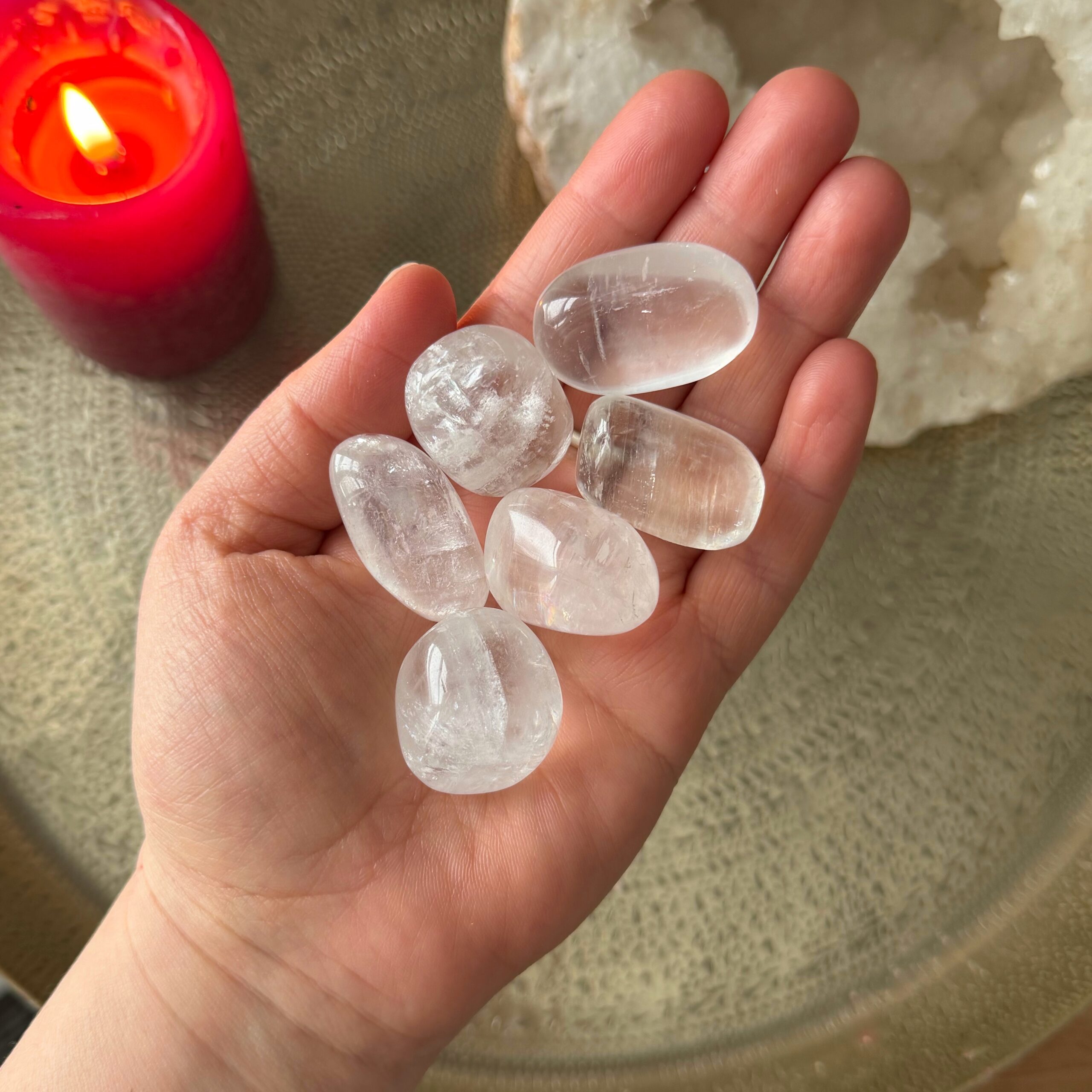 Diese lichtvollen Calcit Trommelsteine wirken zugleich ordnend und klärend. Klarer Calcit steht für Reinigung, innere Ordnung und feine energetische Reinigung. Er hilft dabei, Gedanken zu sortieren und emotionale Spannungen sanft zu lösen.  Besonders für feinfühlige Menschen ist er ein schöner Begleiter, der Stabilität und innere Ordnung fördert.