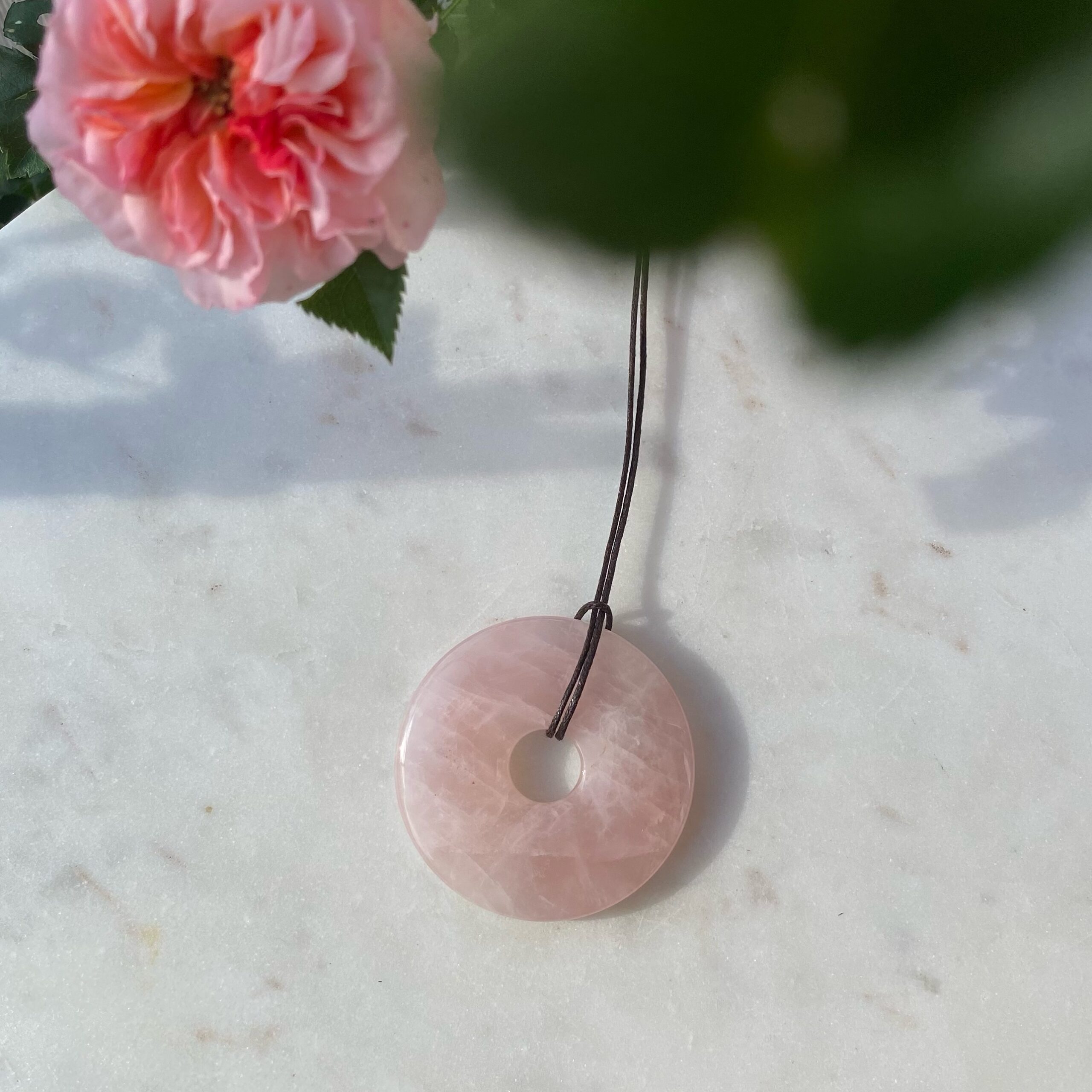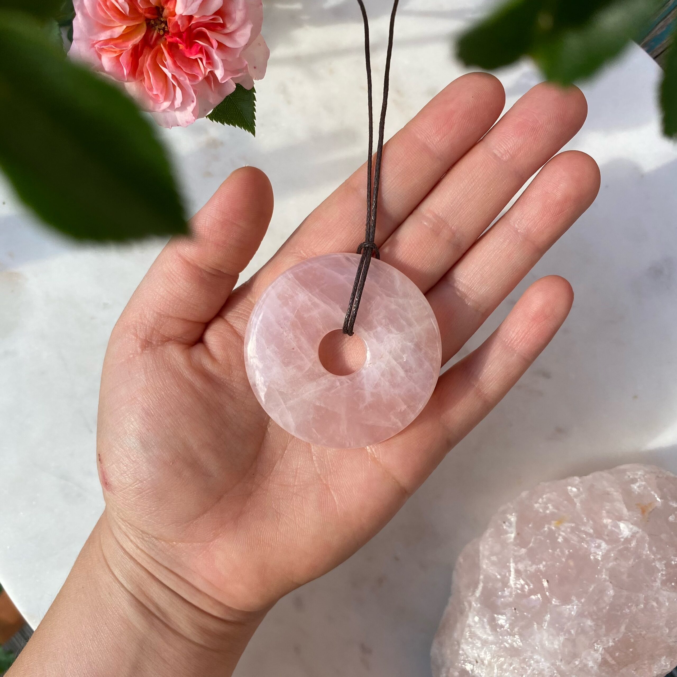 Diese kraftvolle Kette mit großer Rosenquarz Scheibe erinnert daran, dass Liebe die stärkste Kraft im Universum ist und ihr Strom nie endet. Rosenquarz ist der Stein des Herzens. Er öffnet dich für die Liebe in all ihren Facetten, nährt Sanftmut und Mitgefühl und erinnert dich daran, dich selbst und andere mit offenen Armen anzunehmen. Die runde Form steht für Vollkommenheit und Einheit, für das Gleichgewicht aus Geben und Empfangen.