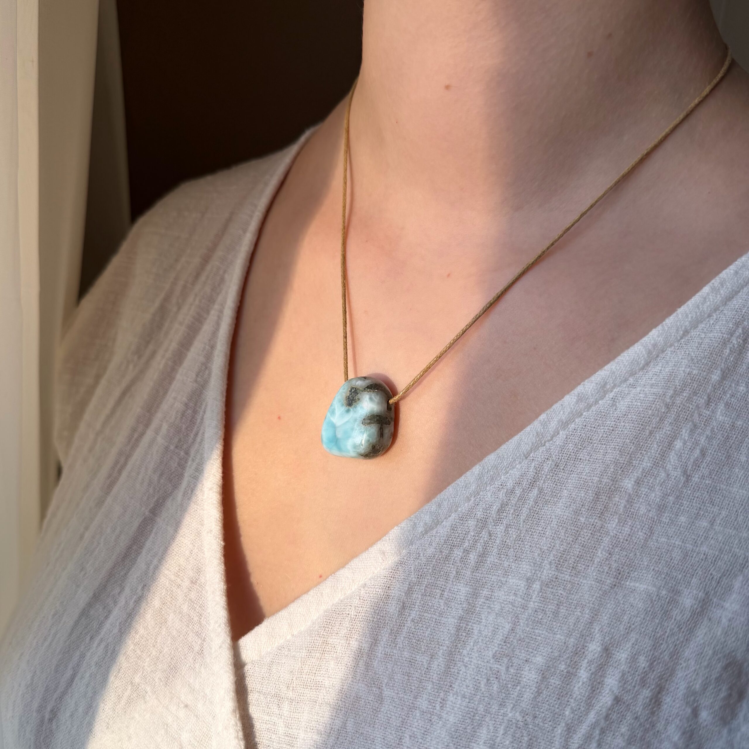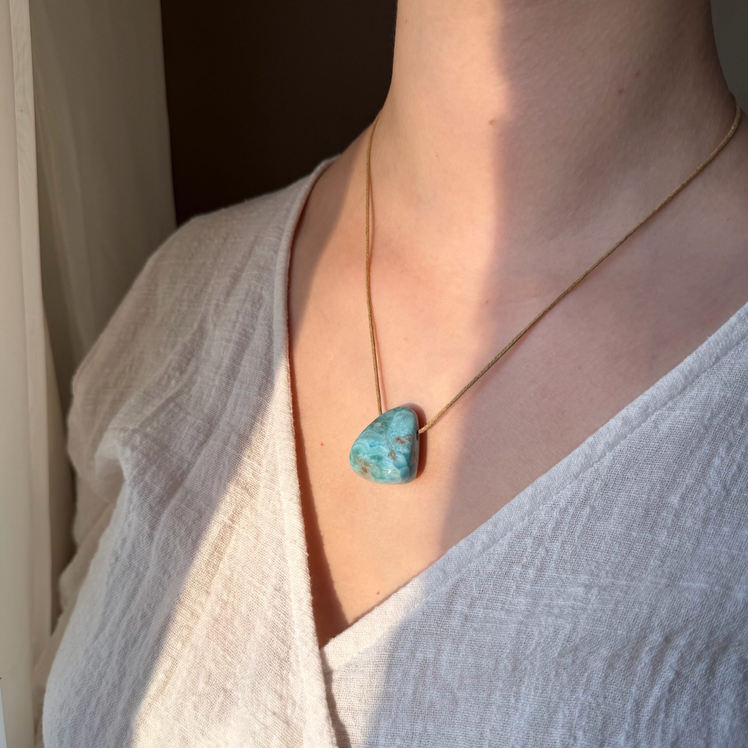 Larimar ist ein außergewöhnlicher Edelstein, der weltweit nur an einem einzigen Fundort vorkommt: in der Dominikanischen Republik. Seine Seltenheit und seine sanfte, zugleich kraftvolle Ausstrahlung machen ihn zu einem ganz besonderen Begleiter. Oft wird er auch als Atlantis-Stein bezeichnet – ein Symbol für Tiefe, Erinnerung und inneres Wissen. Jede Larimar-Kette wird intuitiv für dich ausgewählt. Nicht du suchst den Stein, der richtige Stein findet dich.