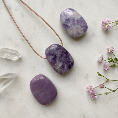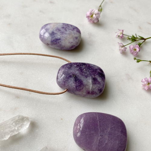 Violetter Lepidolith Begleiter an einem zarten Lederband für Schutz, Unabhängigkeit und innere Gelassenheit.