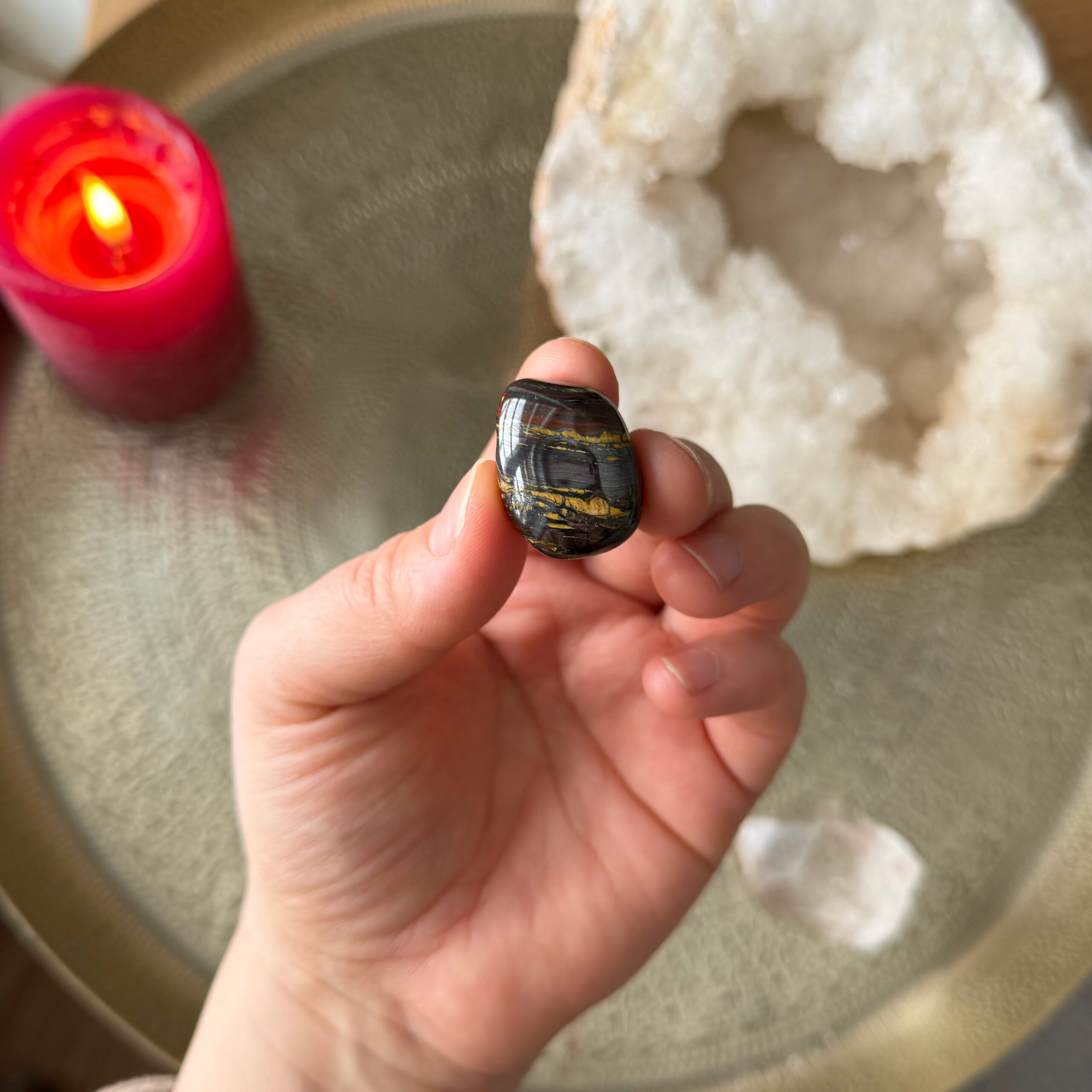 • Tigereisen steht für verkörperte Stärke und gelebte Entschlossenheit. Dieser Stein trägt eine uralte Kraft in sich. In seinen Schichten verbinden sich dunkle Tiefe, warmes Rot und goldene Lichtadern. Wie Feuer, Erde und Sonne in einem Stein vereint. Seine Energie ist klar, kraftvoll und zugleich stabilisierend.