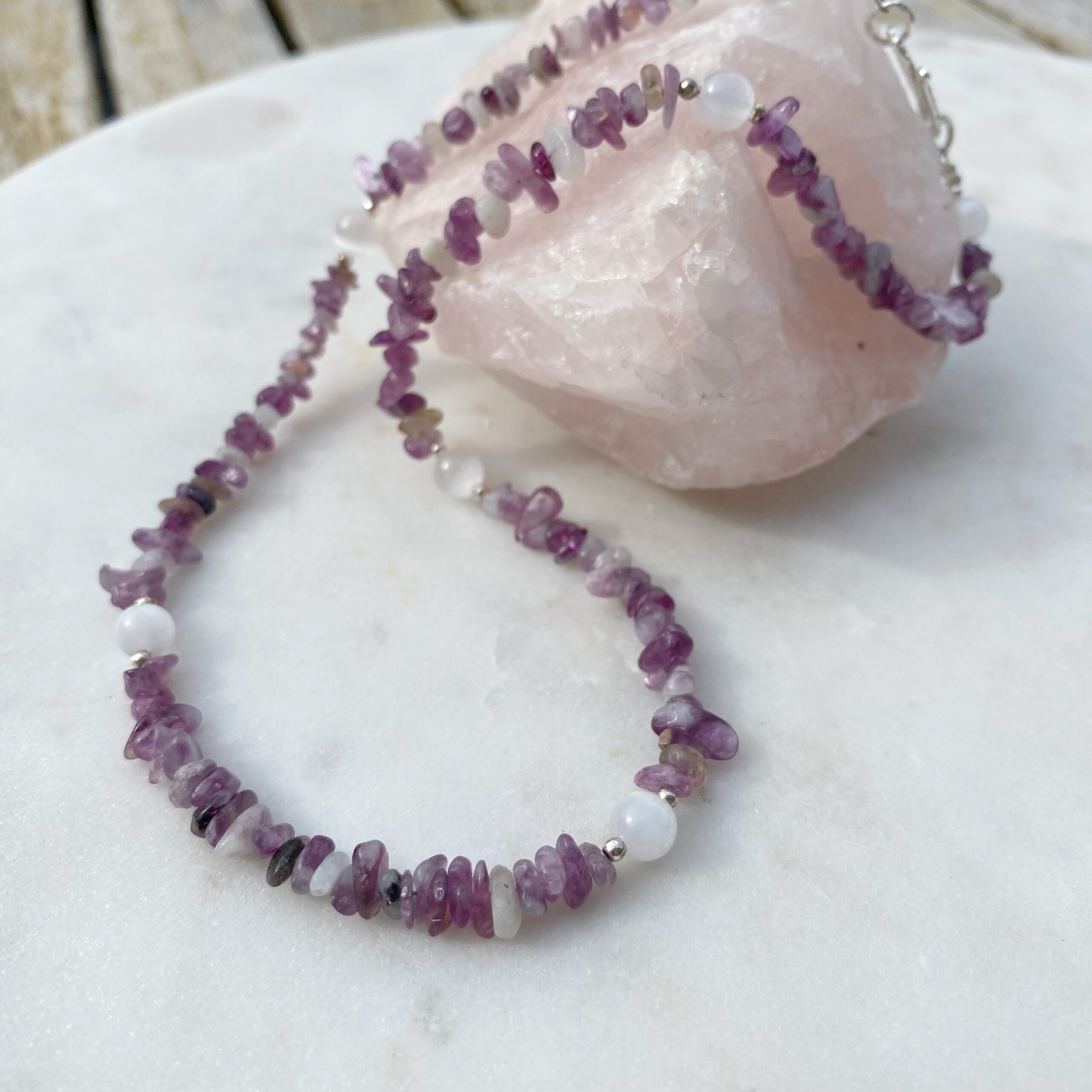 Die Kette MONDGÖTTIN vereint die sanfte Kraft des Lepidoliths mit der reinen Klarheit des Selenits. Lepidolith schenkt Ruhe, Gelassenheit und stärkt die Verbindung zu deiner inneren Stimme, während Selenit dich mit Licht, Klarheit und der Energie des Mondes umhüllt. Gemeinsam erinnern dich die Steine daran, deiner Intuition zu vertrauen und in deinem weiblichen Zyklus aus Licht und Schatten Heilung zu finden. Ein Schmuckstück voller Magie und Weiblichkeit, das für Zartheit, Schutz und Transformation steht.