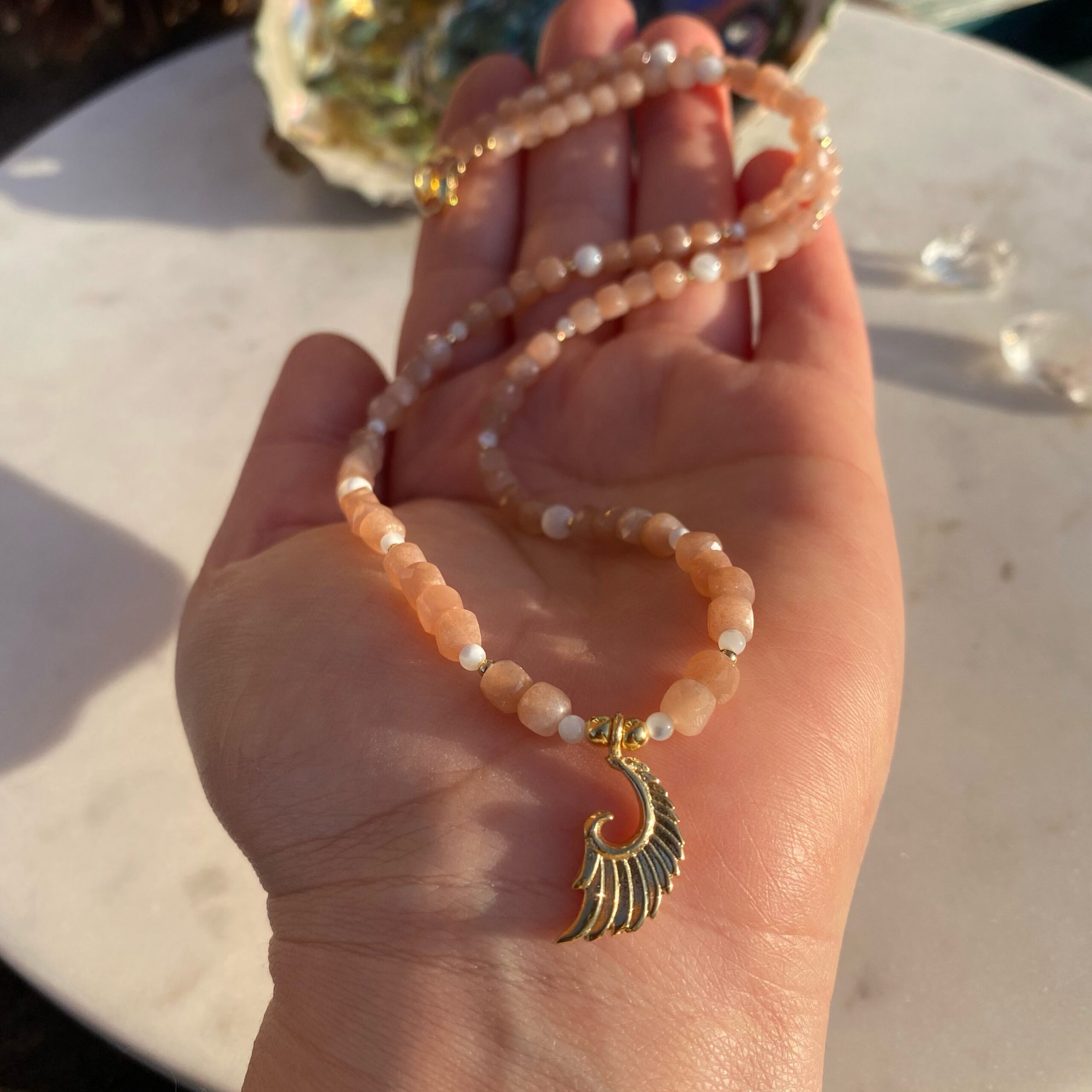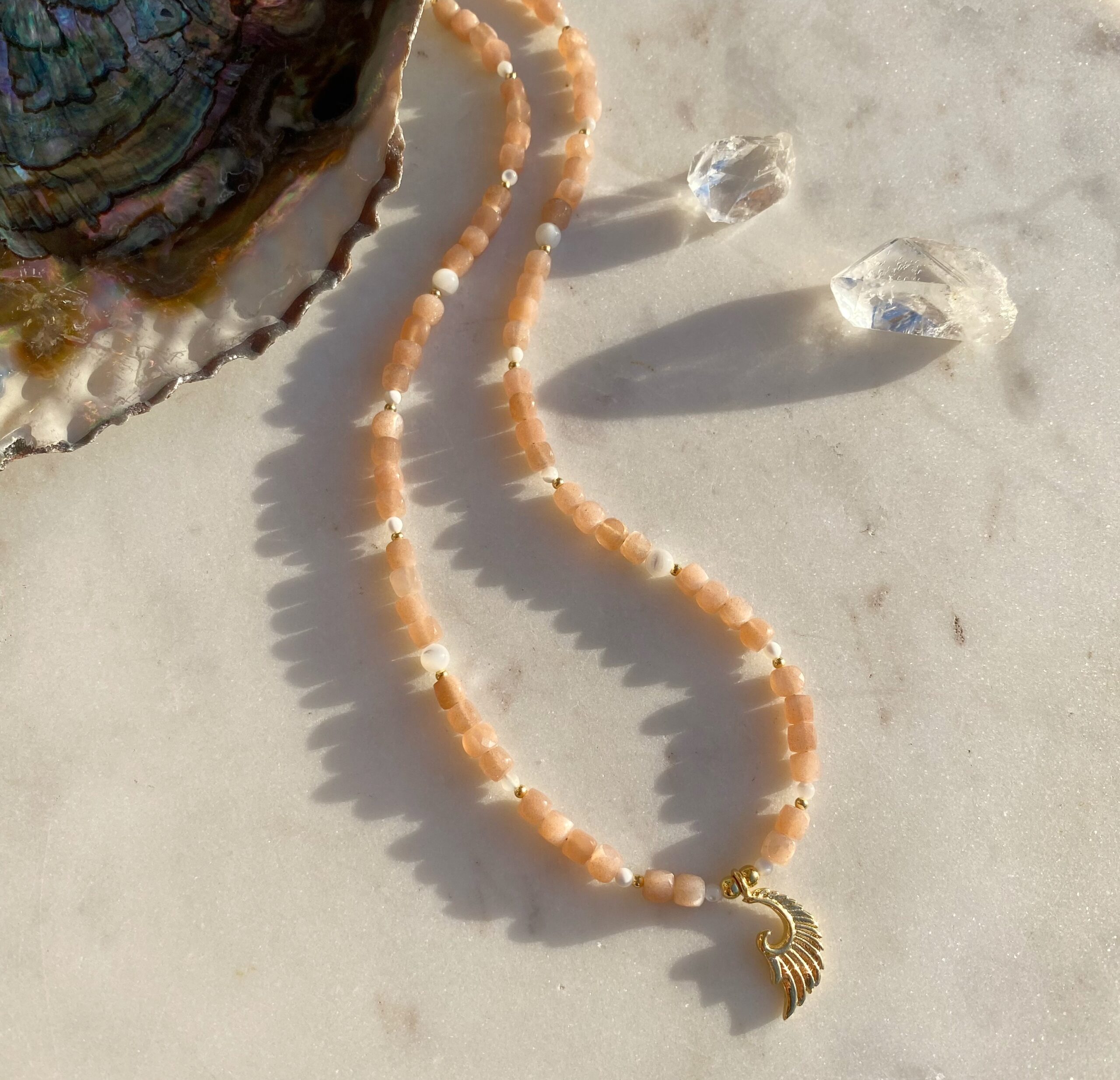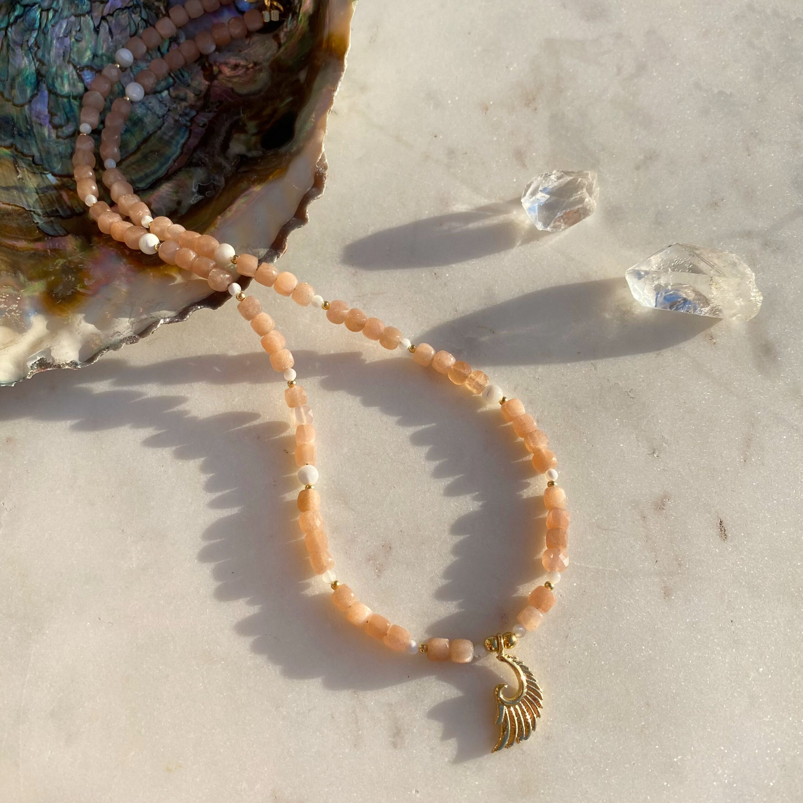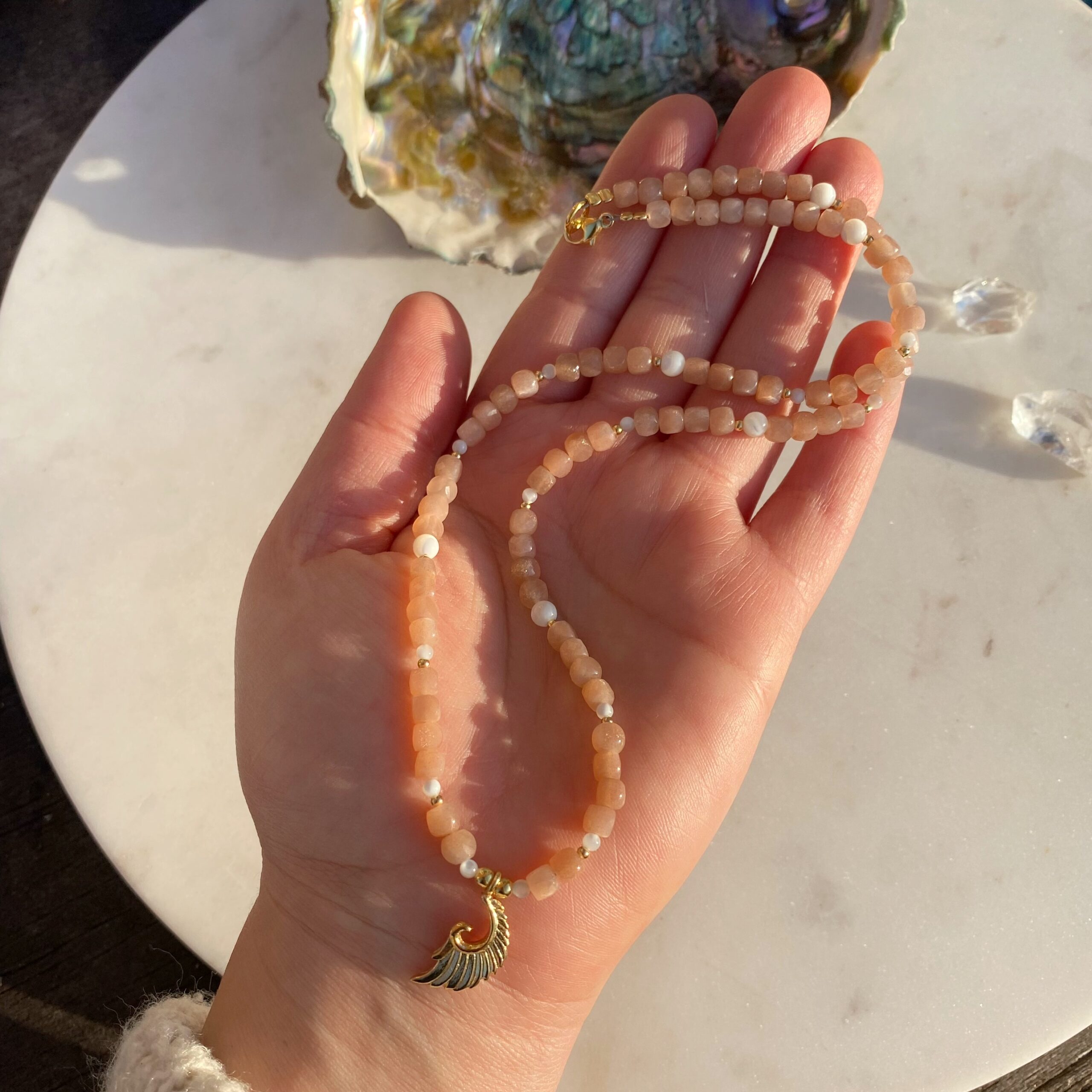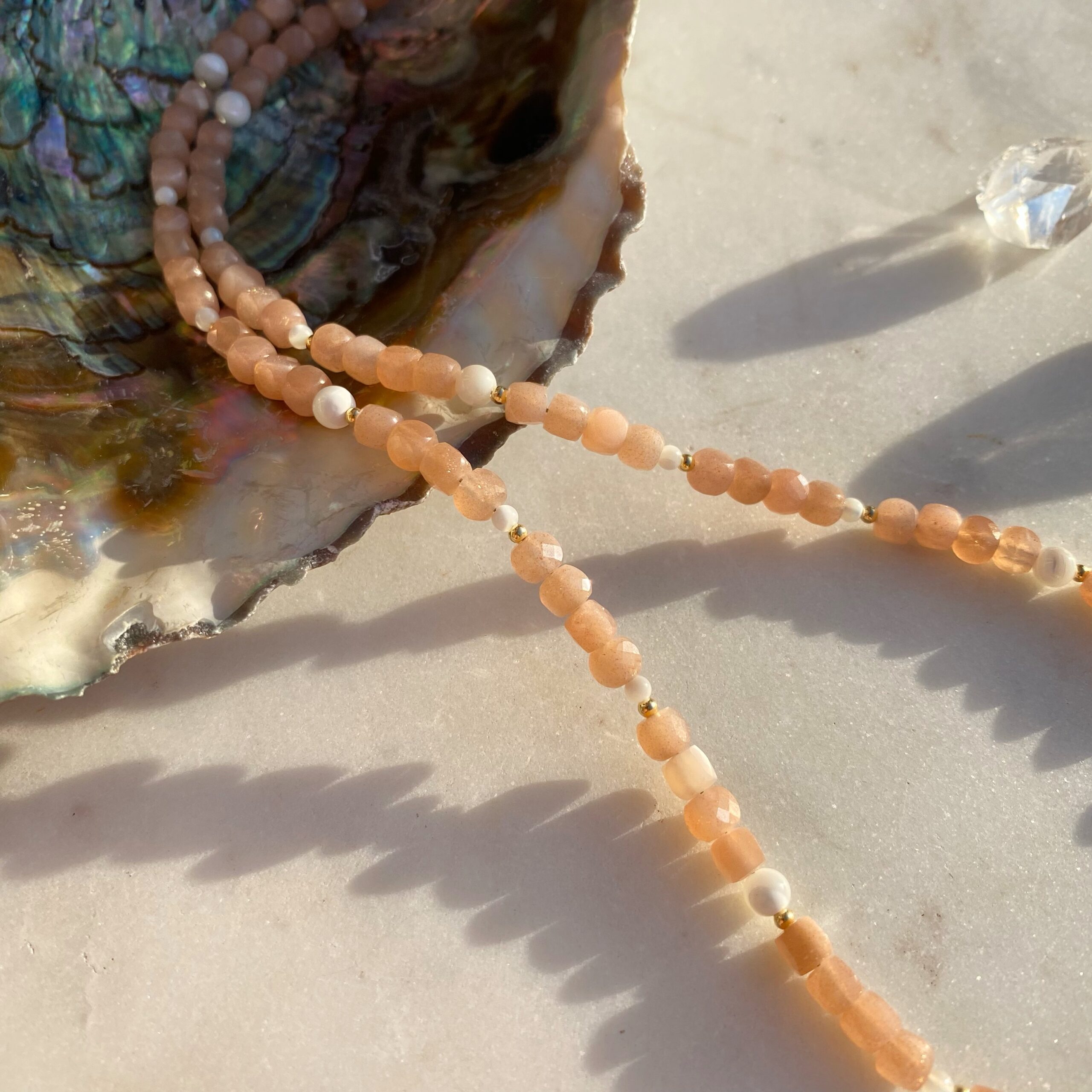Diese zarte, festliche Kette strahlt die warme, schützende Energie des Mondes aus. Facettierter Aprikosenmondstein in sanft schimmernden Pfirsichtönen wird von kleinen Perlmuttperlen begleitet, die das Licht weich reflektieren und feminine Leichtigkeit einladen.