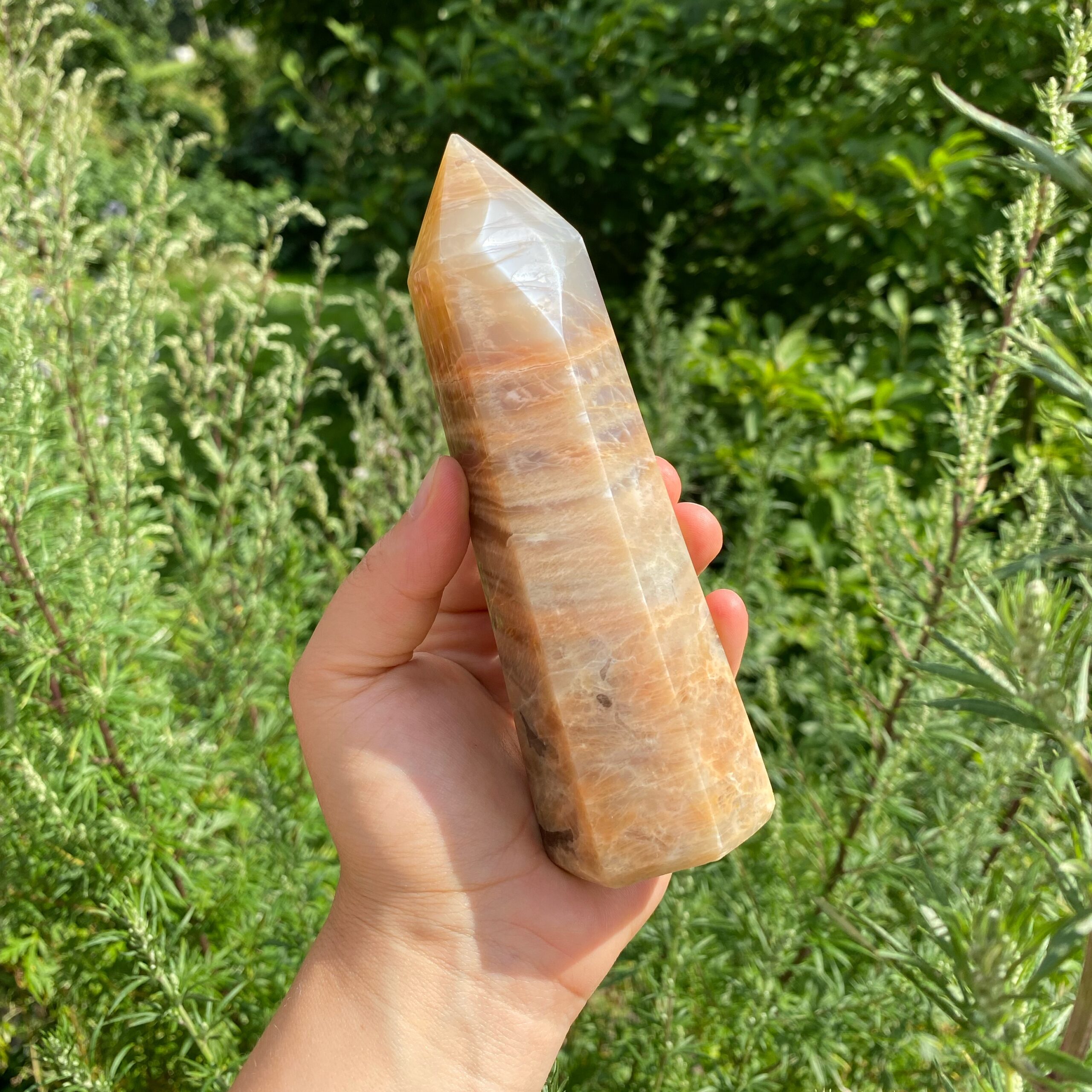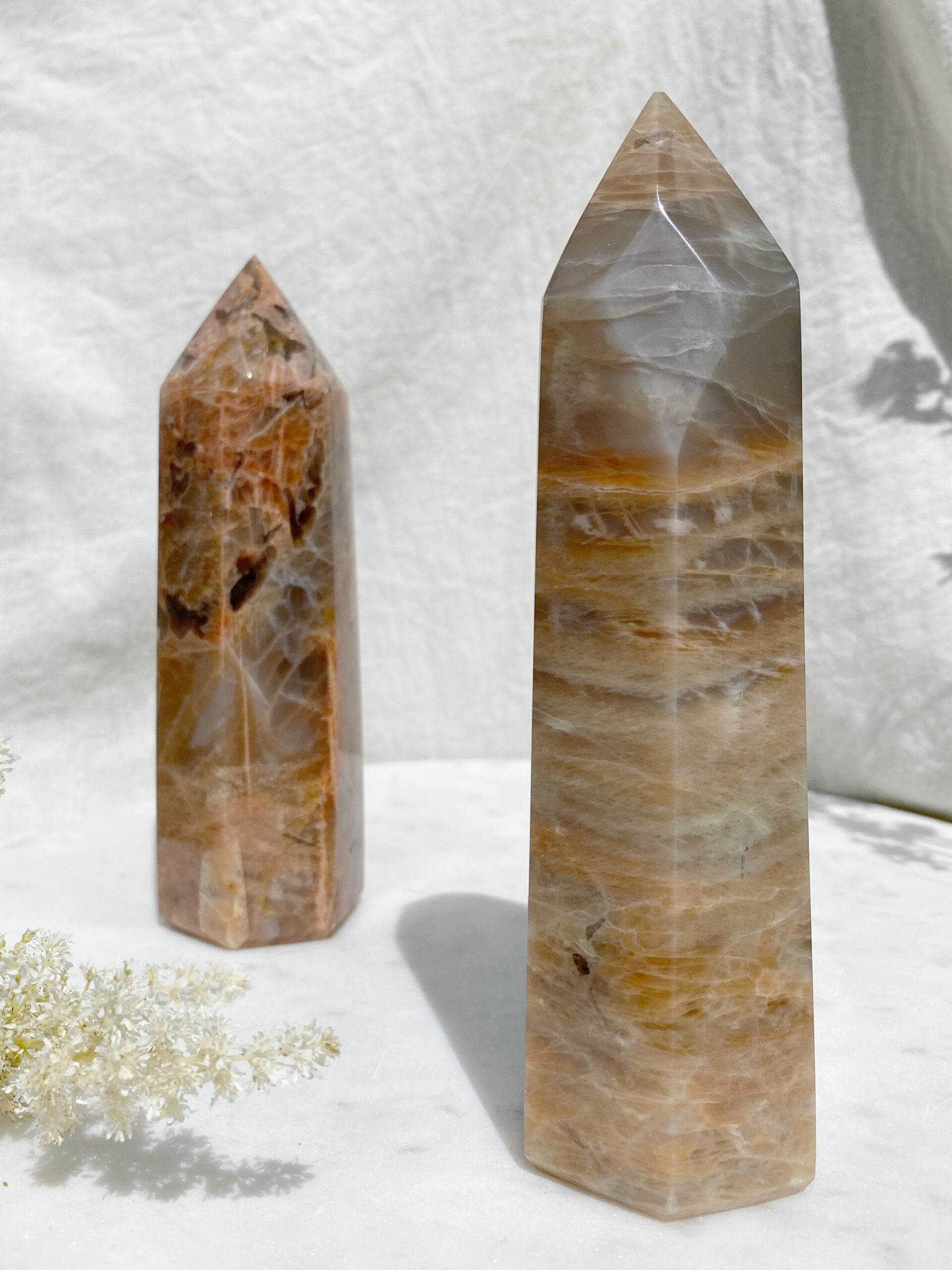 Großer Mondstein Turm mit Standfläche für Weiblichkeit, Verbundenheit und eine starke Intuition. Bewegst du deinen Mondstein im Sonnenlicht hin und her kommt ein sanfter Schimmer zum Vorschein.