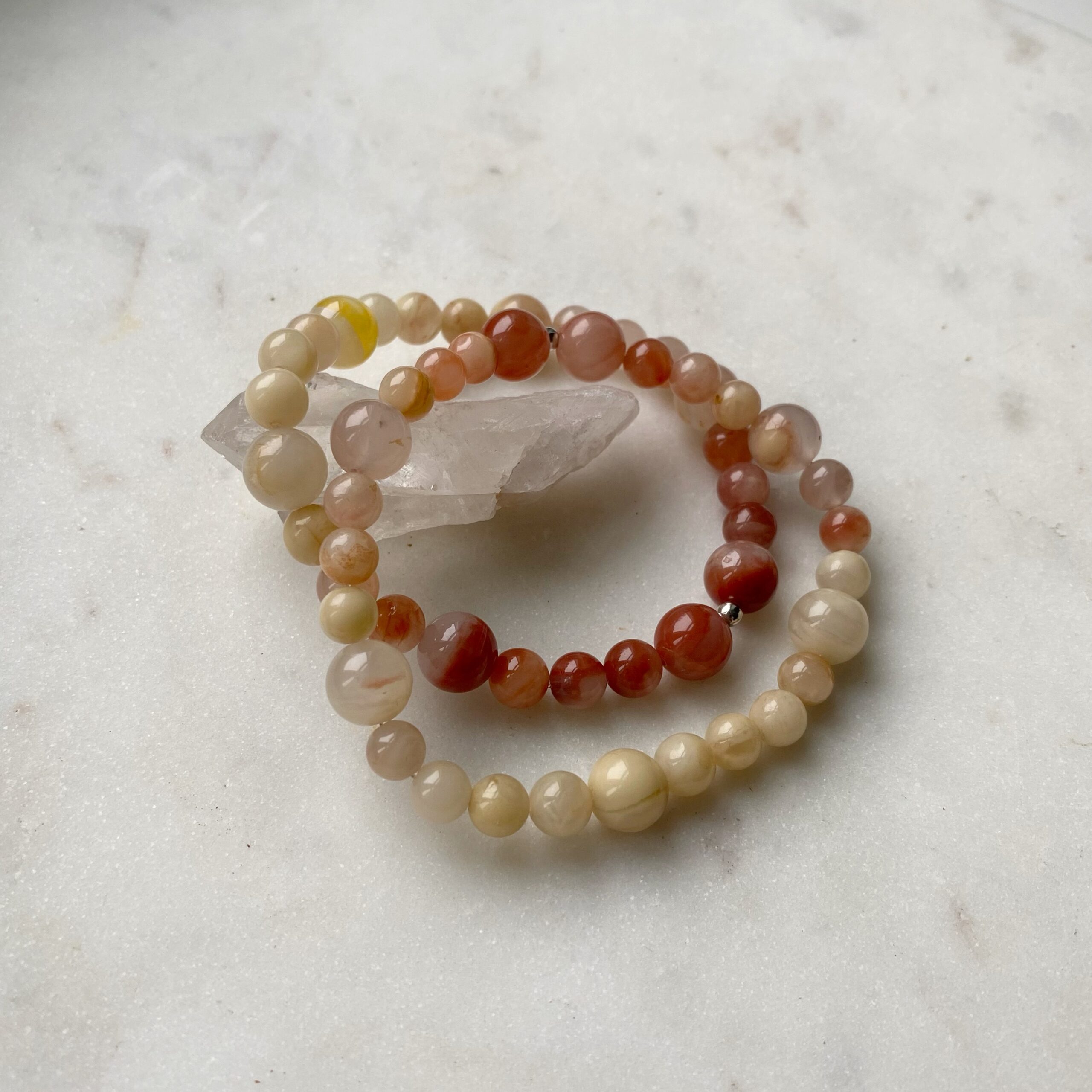 Dieses harmonische Armband vereint die sanfte Wärme von Elfenbein, Honig und leuchtendem Rot zu einem fließenden Farbverlauf, der Erdung und Lebendigkeit in Balance bringt.