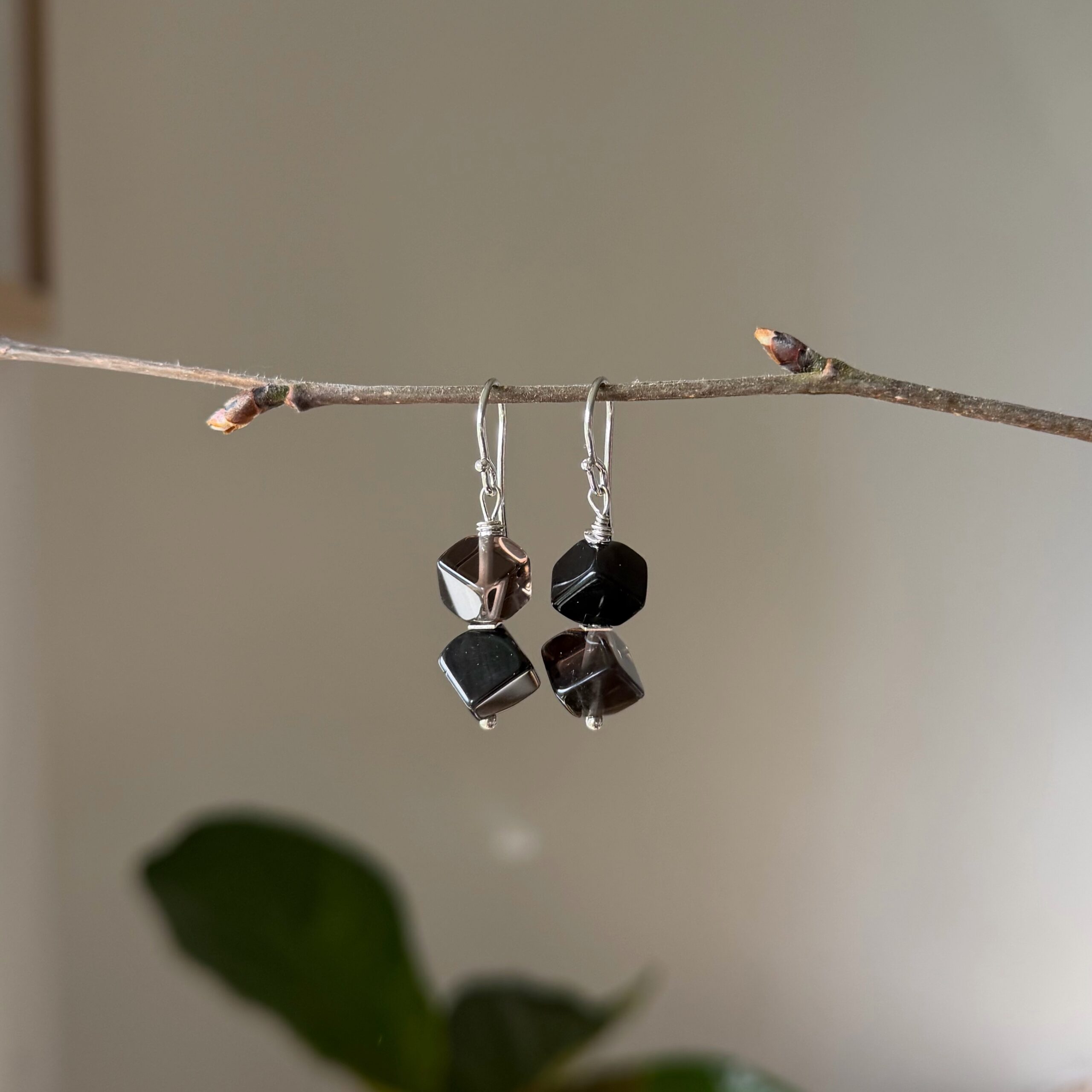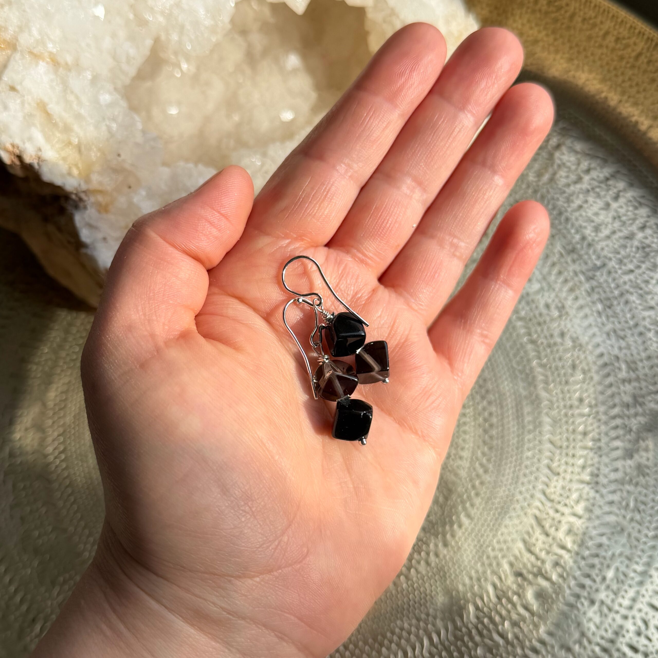 Diese handgefertigten Ohrhänger verbinden die schützende, transformierende Energie von Obsidian mit der erdenden Tiefe des Rauchquarzes. Die diagonalen Würfel schimmern dezent im Licht und verleihen den Ohrringen eine ruhige, zugleich kraftvolle Ausstrahlung. Sie begleiten dich dabei, dich abzugrenzen, Anspannung loszulassen und gleichzeitig klar und ganz bei dir zu bleiben.