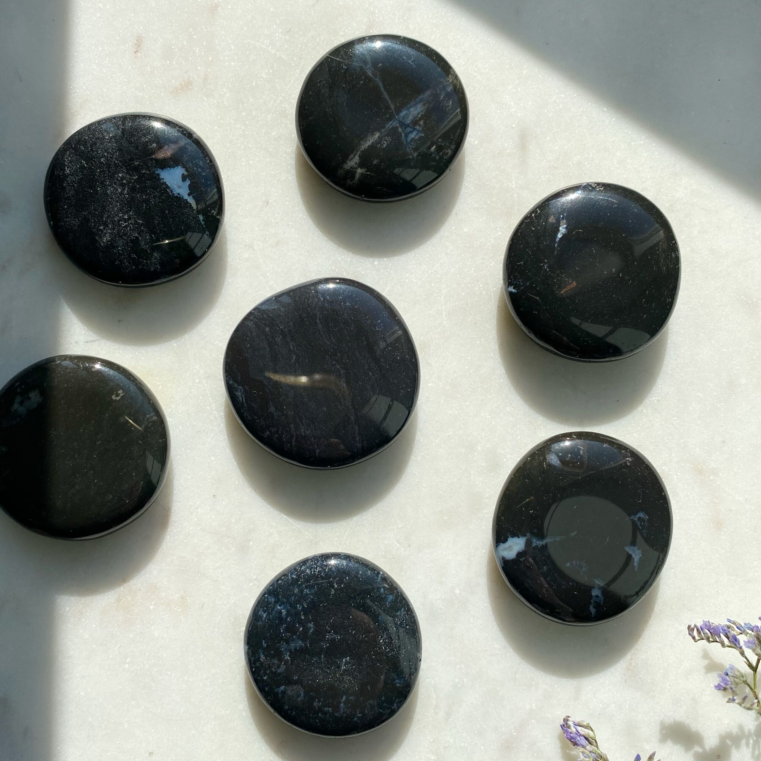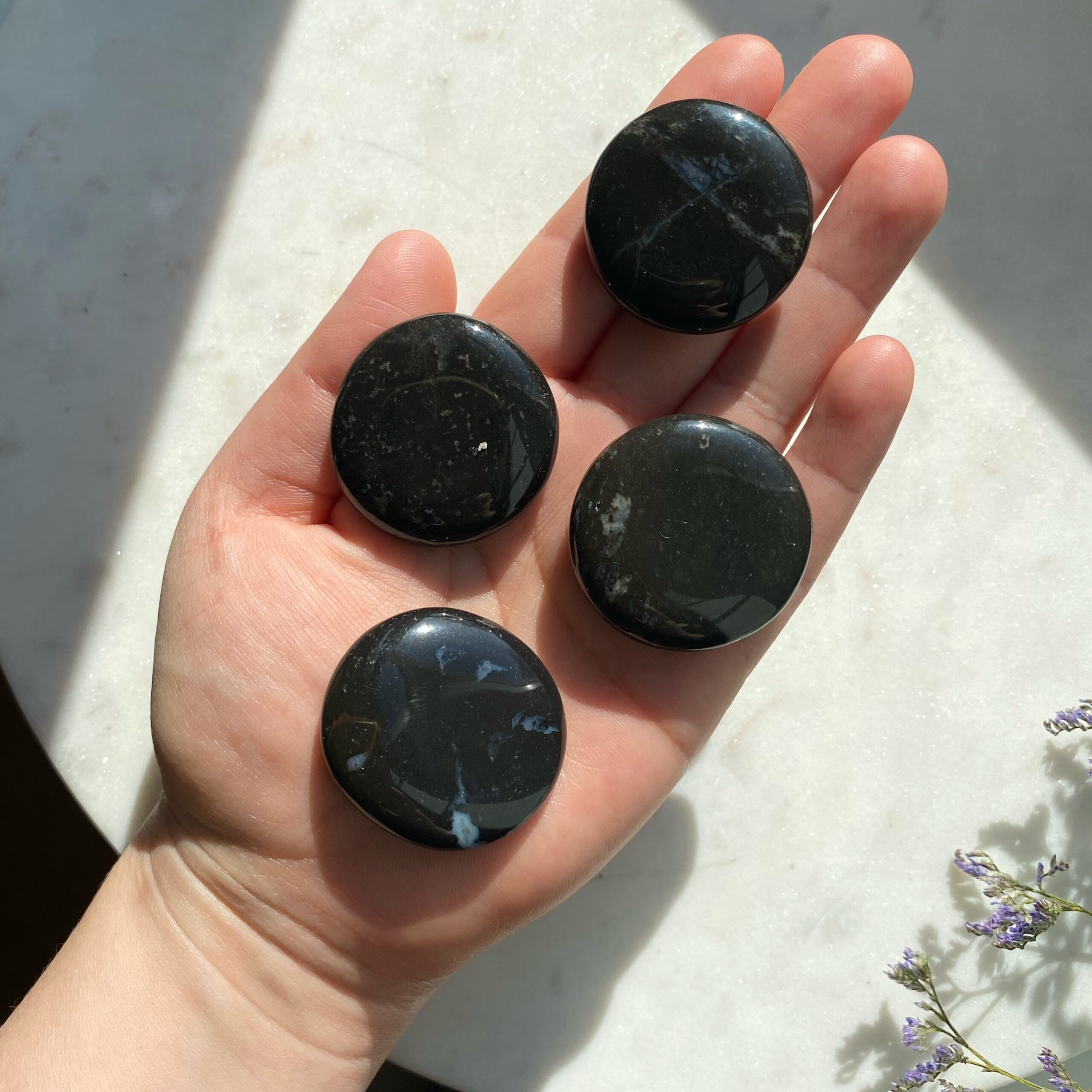 Natürlicher schwarzer Onyx Scheibenstein für Durchsetzungskraft, Erdung und Selbstverwirklichung. Da viele Menschen sich einen komplett schwarzen Onyx wünschen, wird dieser Stein leider oft eingefärbt – das ist bei diesen Exemplaren nicht der Fall! Die hellen Einschlüsse, die bei einigen Steinen zu finden sind, sind natürlichen Ursprungs und zeigen an, dass diese Onyxe nicht gefärbt wurden.