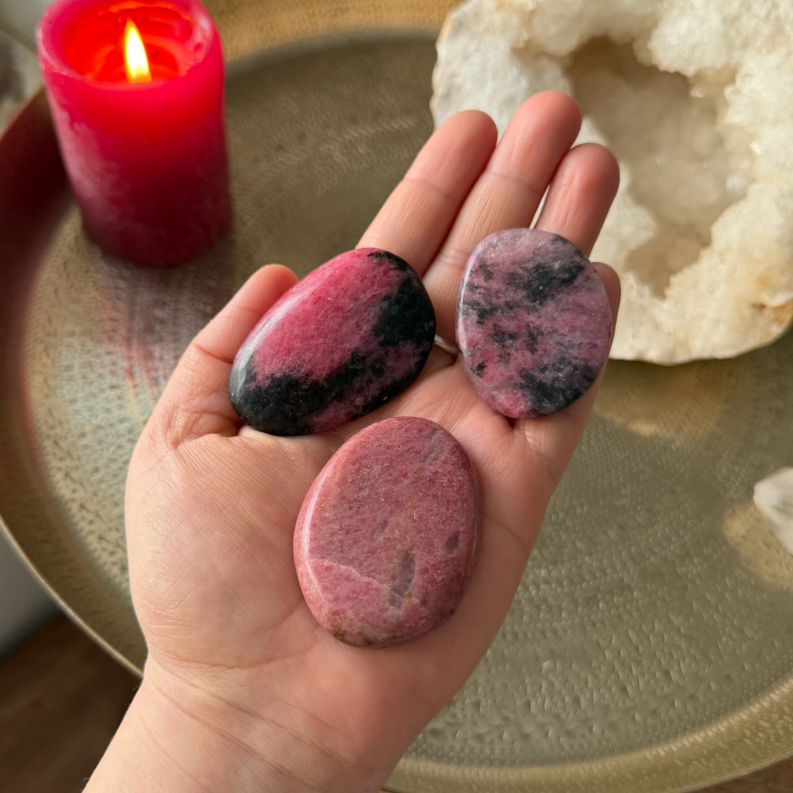 • Jeder Rhodonit ist ein absolutes Unikat und wir wählen den Stein intuitiv für dich aus. Farbe und Muster deines Steines können von den Bildern abweichen. Die Farben reichen von rosé, über pink bis fast schwarz.
