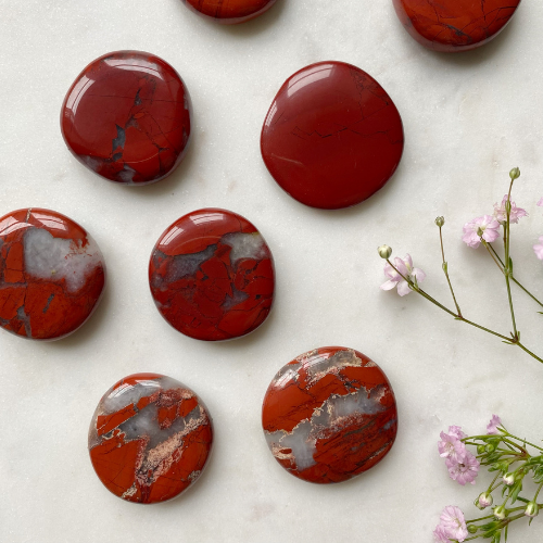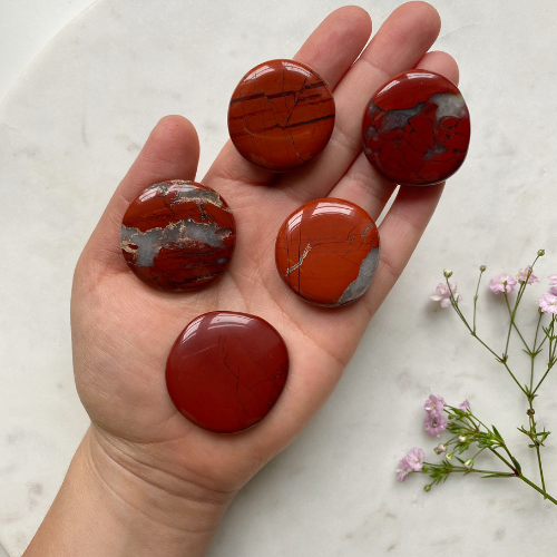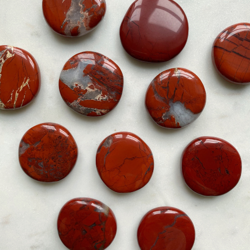 Roter Jaspis Scheibenstein für Lebenskraft, Vitalität und starke Erdung. Einige Steine verfügen über natürliche Quarz-Einschlüsse.