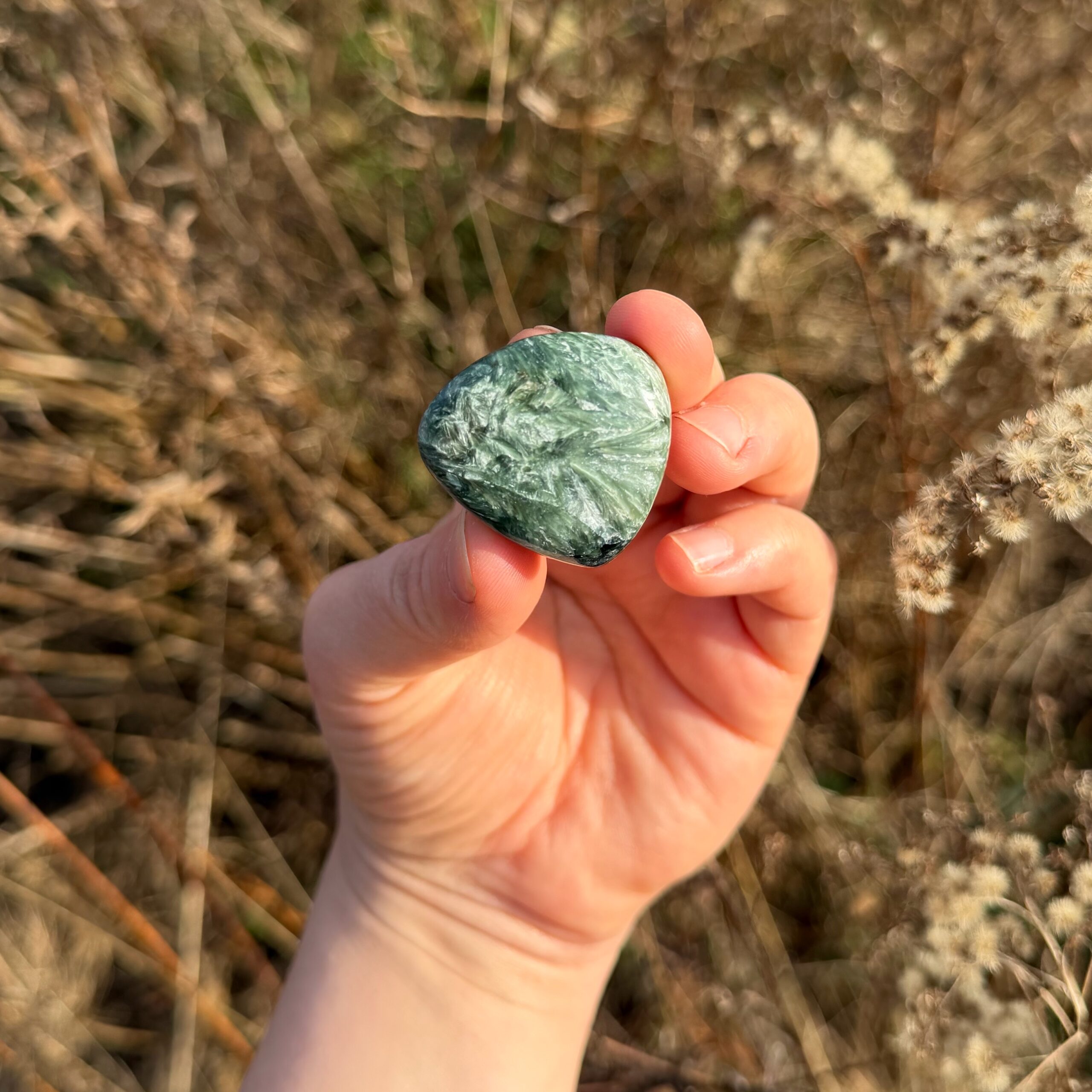 Dieser polierte Seraphinit Trommelstein fasziniert durch seine tiefgrüne Farbe mit schimmernden, federartigen Strukturen, die oft als „Engelsflügel“ im Stein beschrieben werden. Seraphinit in getrommelter Form ist äußerst selten.